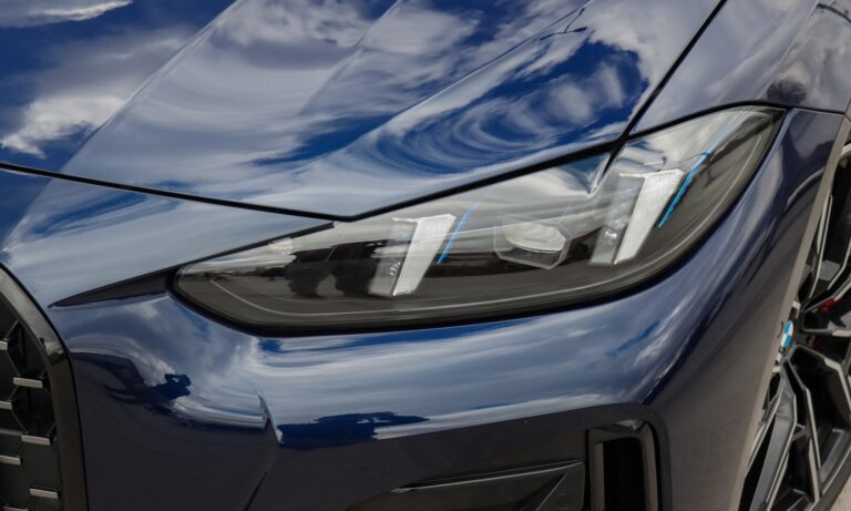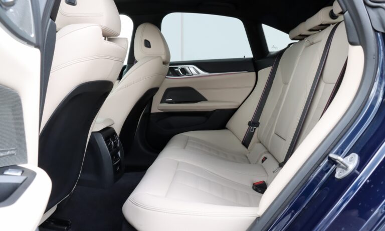 Agresszív kiállású autó a 430d Gran Coupé ezzel az M Sport csomaggal, de pontosan ez áll jól a karakterének. A morcosan néző fényszórókban mátrix LED világít, a dupla nappali menetfényei pedig hasító nyílhegyet formáznak, fűzött mintás hűtőmaszkja pedig uralja az egész pofáját, mintha valami fújtató ragadozó volna. Sokkal jobban szerettem azt a korszakot, amikor a BMW még nem engedte meg magának a fekete kiegészítőket és a piros féknyerget, de a 4-es Gran Coupé annyira eltalált forma, hogy még ezeket is méltósággal tudja viselni. Fűzött fényfonalak futnak a lézeres hátsó lámpákban, amiket először az M4 CSL-en használtak, de a frissítéssel a visszafogottabb 4-esekhez is elérhető.