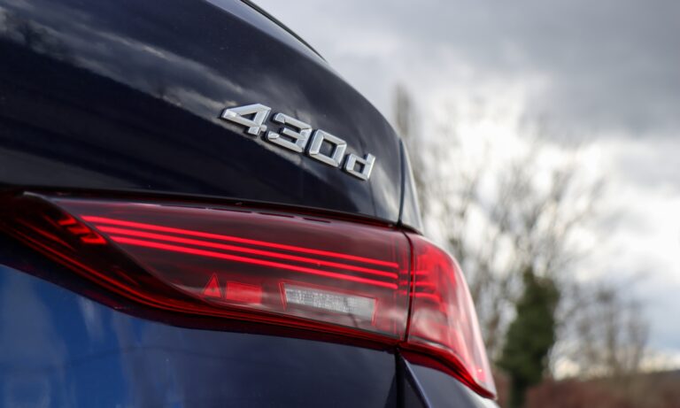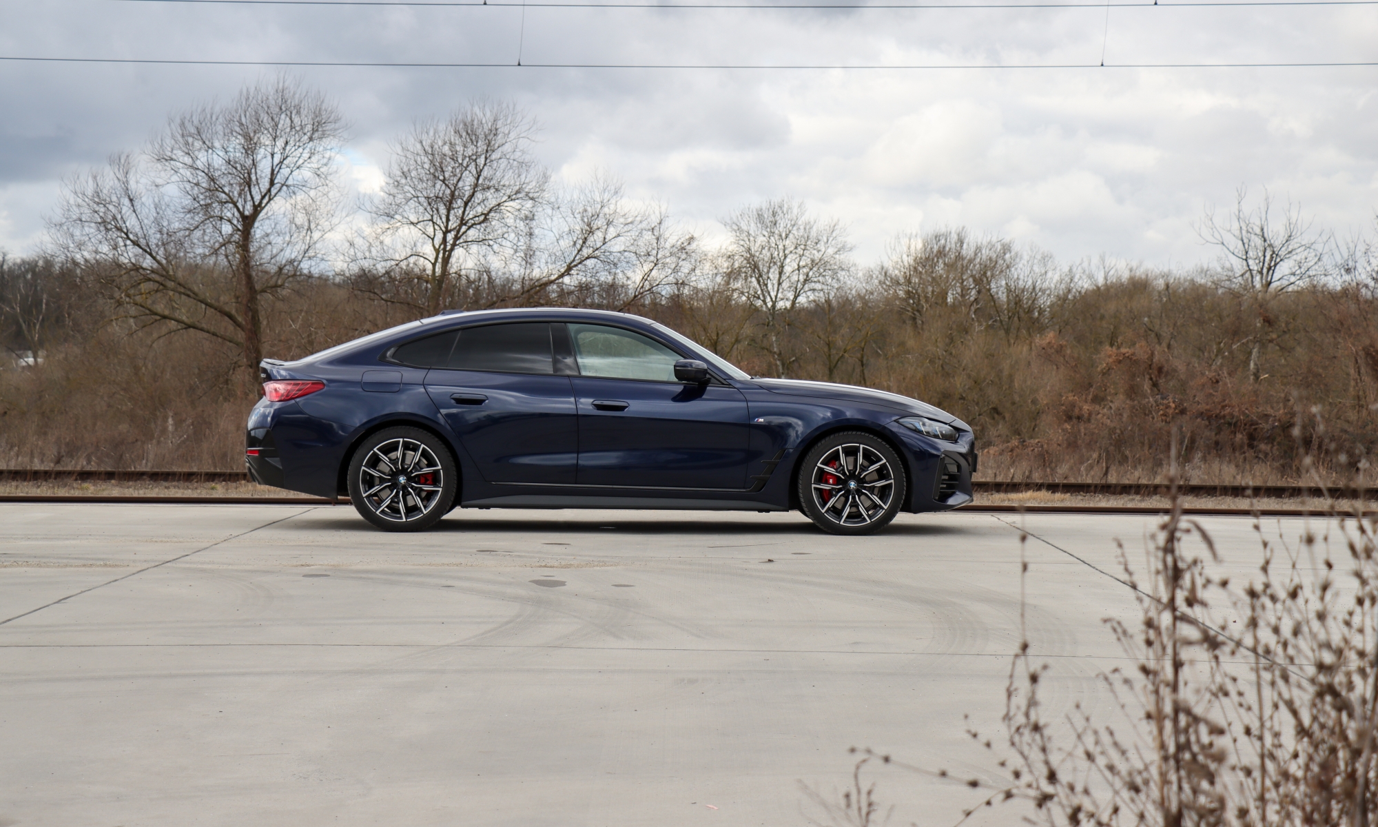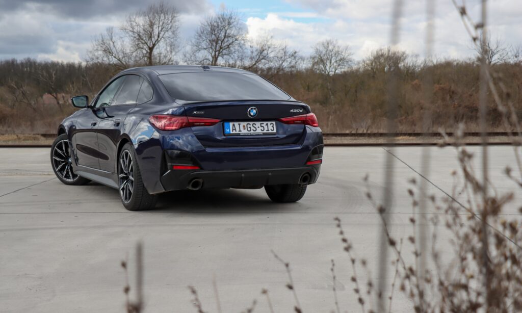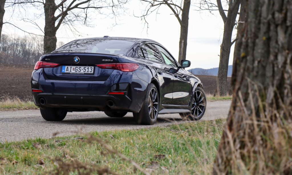 Nagyszerűen látszik rajta, hogy a 4-es Gran Coupé egy hosszmotoros és alapvetően hátsókerekes autó, de kellően izmosan feszül az útra ahhoz, hogy világos legyen az is, nem pehelysúlyú gép. A 430d kizárólag összkerékhajtású (xDrive) lehet, van benne sorban hat dugattyú, egy mild hibrid rendszer, biztonságos és kényelmes, ezért aztán több mint 1,9 tonna. Ha már nosztalgia, akkor ez így csak 75 kilogrammal nehezebb egy V8-as, automata váltós E39-es 540i Touringnál.