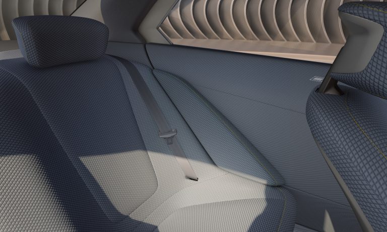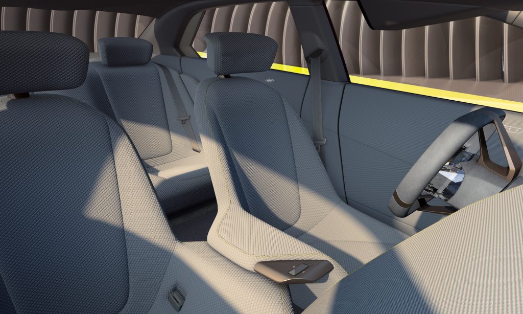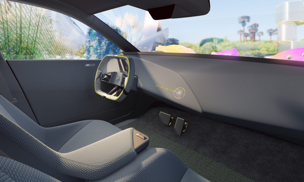 Újrahasznosított anyagokkal kárpitozott utastere letisztult formavilágú és a gombokkal együtt az érintőkijelzőket, de még az óracsoportot is eltűntették a műszerfalról. A két első ülés közötti könyöklőn található az irányválasztó, minden információt a teljes szélvédőt lefedő Head-up Display jeleníti meg, a kiterjesztett valóságot pedig az oldalablakokra vetítő projektorok festik (BMW Mixed Reality).