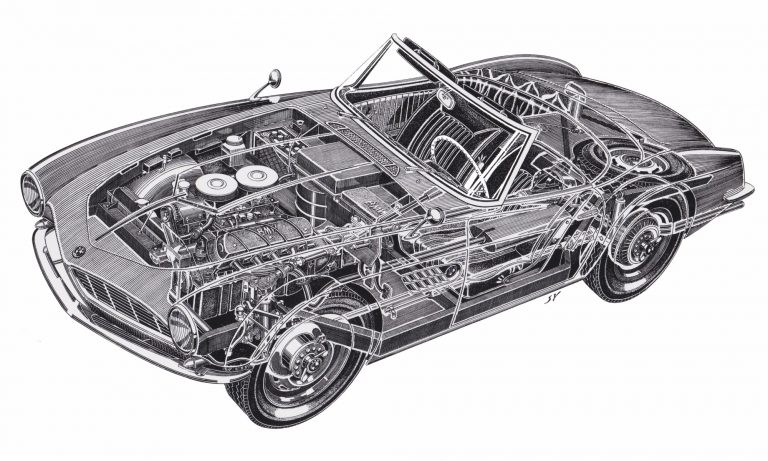 Most pedig öröm ránézni, mert fehér roadster szebb, mint valaha, a fényezéssel harmonizáló, kontrasztos fekete betétekkel díszített bőrkárpit pedig hibátlanul feszül az üléseken. Csontszínű kormánya mögött ékszerszerűek a míves kidolgozású műszerek. Látszik, hogy az autó minden apró részletét újraalkották a restaurálás során, és ez alól a 150 lóerős, 3,2 literes, V8-as motor sem volt kivétel.