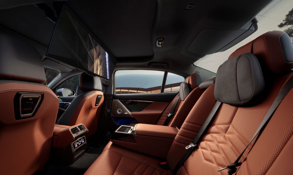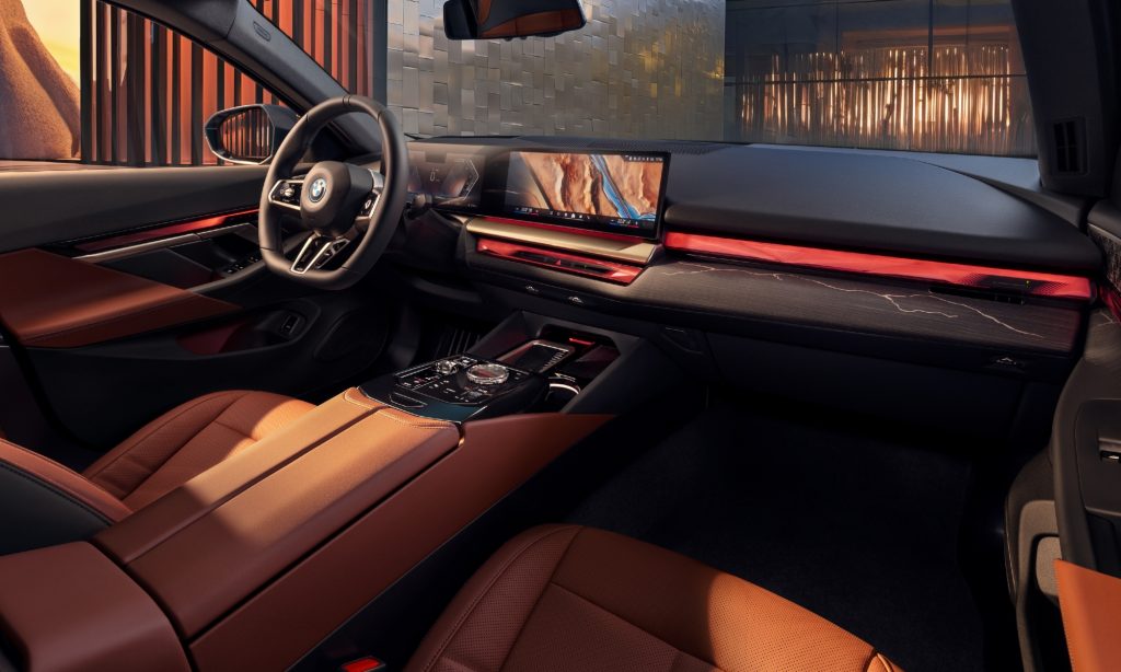 Igazán az utastérben ad többet a kínai 5-ös BMW a klasszikus változatnál, mert a nagyobb lábtéren túl ebben is megjelenik a 7-esben bemutatkozó Theatre Screen, vagyis a tetőből lehajló 31,3 colos képátlójú, 8K felbontású kijelző, ami a Bowers & Wilkins hifivel együtt igazi guruló mozivá változtatja az autót. Műszerfalát a hajlított kijelző uralja, mely valójában két képernyőből áll. A középső érintőkijelzőn a BMW felhőn keresztül frissülő operációs rendszere fut, alatta pedig az Interaction Bar található.