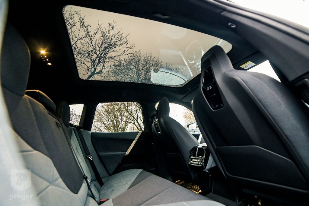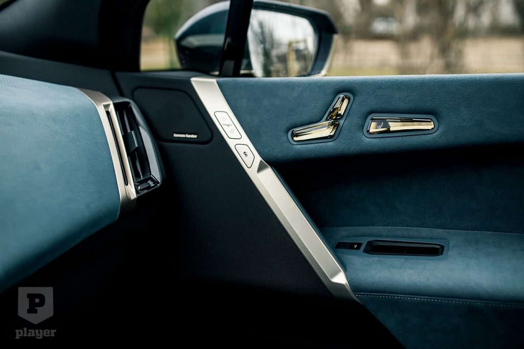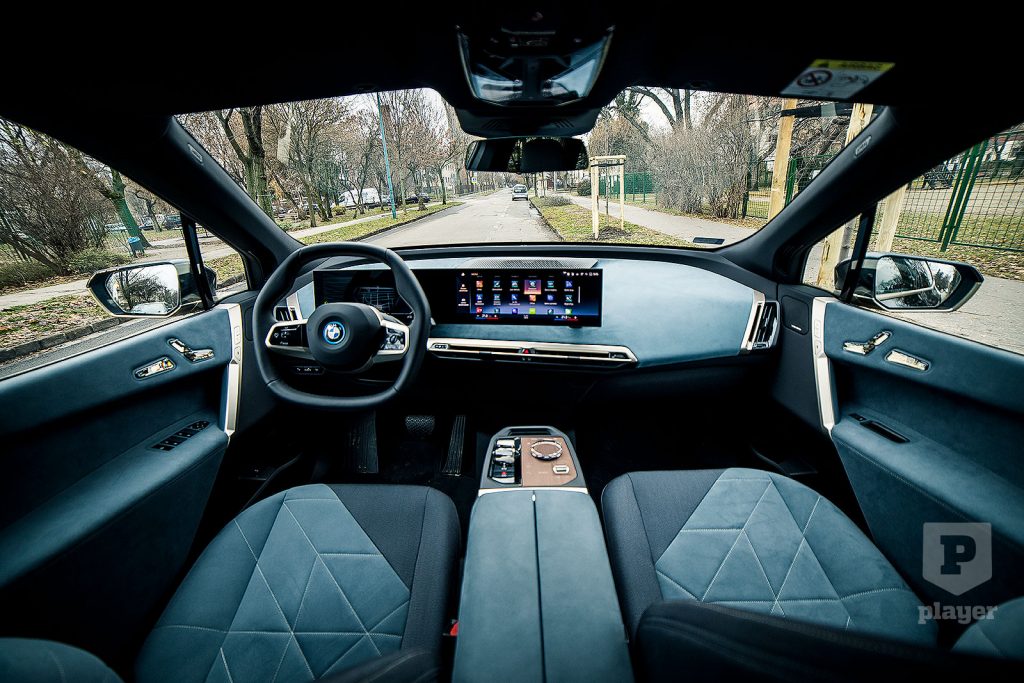 Az utastér stílusa remekül passzol a külsőhöz. Ülések helyett óriási kagylófotelek kerültek előre, hátul pedig egy széles kanapén lehet lágyan elomlani, hatalmas lábtér mögött, tágas fejtér alatt. A tesztautó kékes árnyalatú plüssös-bársonyos kárpitanyagai is sokkal inkább emlékeztetnek egy nappali ülőgarnitúrájára, mint autóülésekre. A szélvédő alatt a műszerfalból kiemelve enyhén ívelten a BMW legnagyobb kettős kijelzője ragyog erős, tiszta fénnyel. Optikailag ez a kabin fókuszpontja, nem a túl nagy, túl vaskos, bután szögletes kormány.