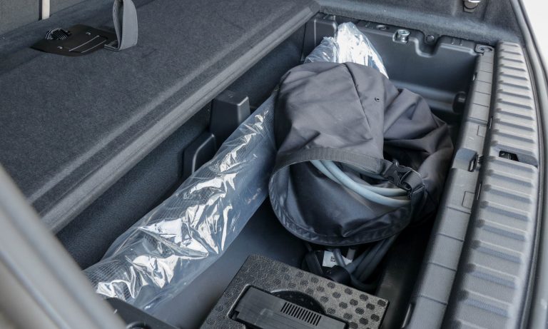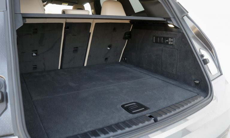 Pazarul összerakott, nesztelen kabinja mögött szépen kárpitozott 500 literes csomagtere van (ülések döntése után 1750 liter), aminek padló alatti üregébe süllyeszthetőek el a töltőkábelek. Hiába akkora, mint egy X5-ös BMW, hiába foglalhatna kis helyet az elektromos hajtás, az iX orrában mégsincs csomagtartó.