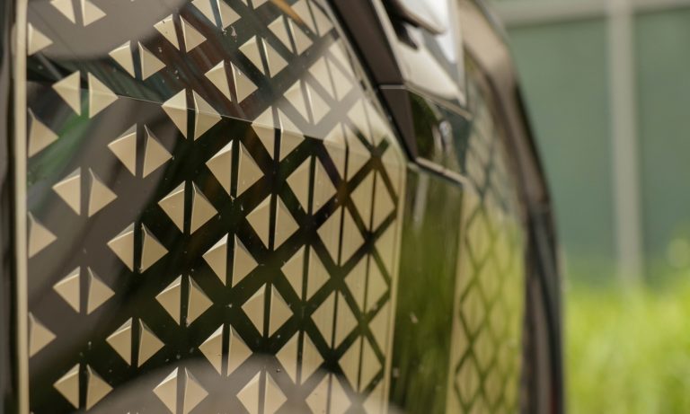Pajzsként hordja a lézer erősítésű adaptív LED-es fényszórói között a függőleges maszkot, mely mögött nincsenek hűtőbordák, csak a szenzorokat és radarokat rejti az arany mintázat mögött.