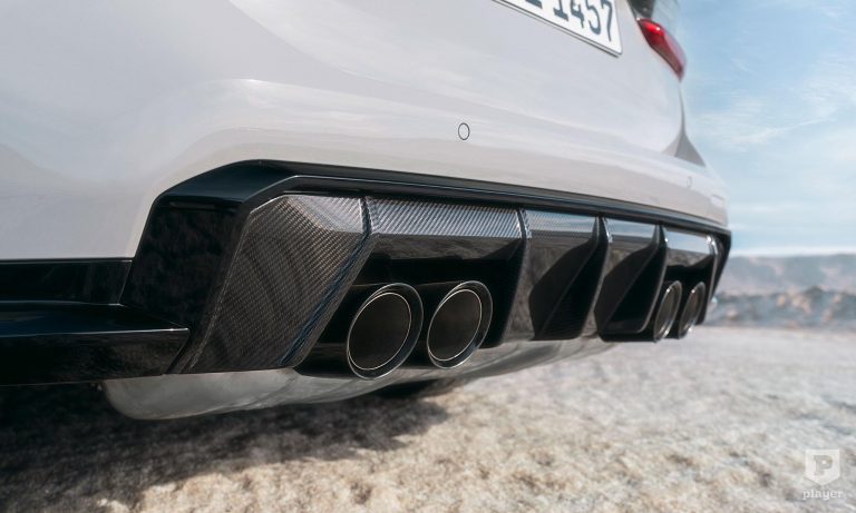 nem hagy kétséget felőle a hátsó légterelő, a diffúzor és a négy kipufogóvég sem. A tető érdekes módon alapból fekete, de plusz pénzért más színben is kérhető, ahogyan szénszálas kiegészítők széles köre is elérhető a kombihoz.