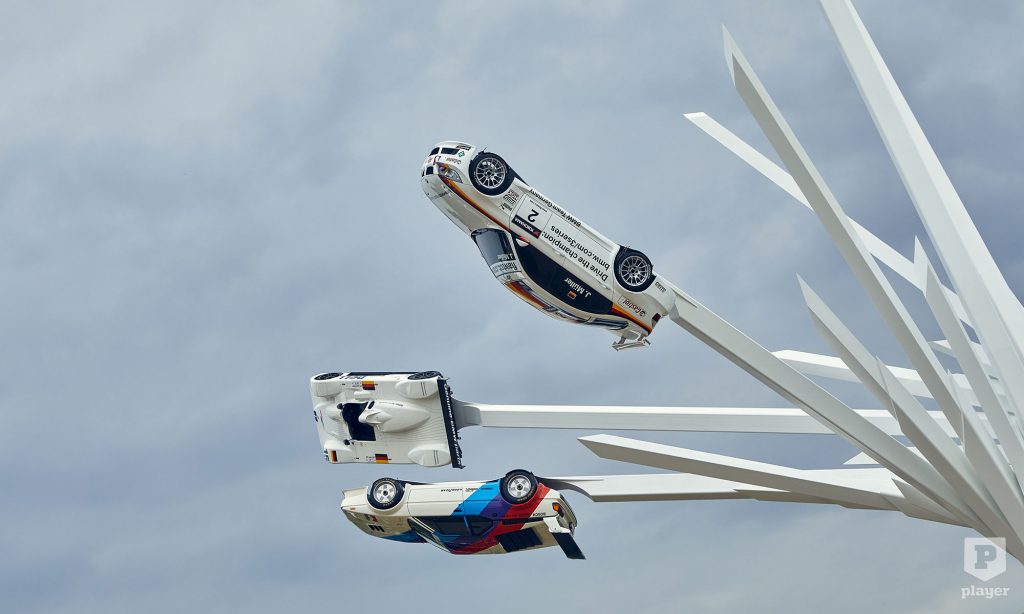 Sugárhajtású repülők és tűzijáték festette kék-lila-vörös színűre az eget, a főbejáratnál pedig az öt legfontosabb M-es BMW díszelgett az ikonikus szobron. És ne gondoljátok, hogy maketteket húztak fel az oszlopokra: valódi gyűjtői darabokat rögzítettek a magasba.