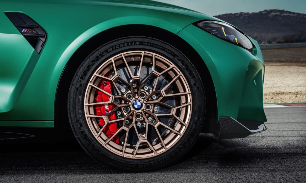 Opcionálisan nagyteljesítményű karbon-kerámia fékek lassítják a kovácsolt alumínium felnikkel szerelt BMW M4 CS-t. Minden apró változtatás értékes kilogrammokkal vagy akár grammokkal csökkenti az autó tömegét, mely összességében húsz kilogrammal könnyebb egy BMW M4 Competition xDrive Coupénál.