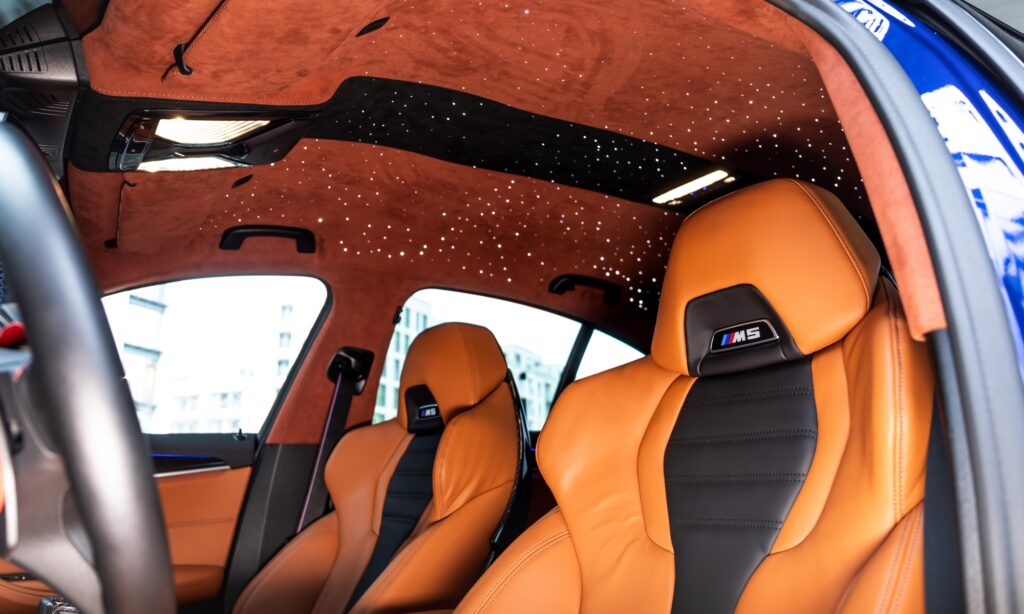 Arany csíkok, karbon aerodinamikai kiegészítők és négy irgalmatlan méretű kipufogócső van a Manhart MH5 900-ason, de az utasterét sem hagyták érintetlenül. Az élénk bőrkárpit mellé színben passzoló alcantara tetőkárpitot készítettek, melyen úgy világít a csillagos égbolt, mint a Rolls-Royce-okban.