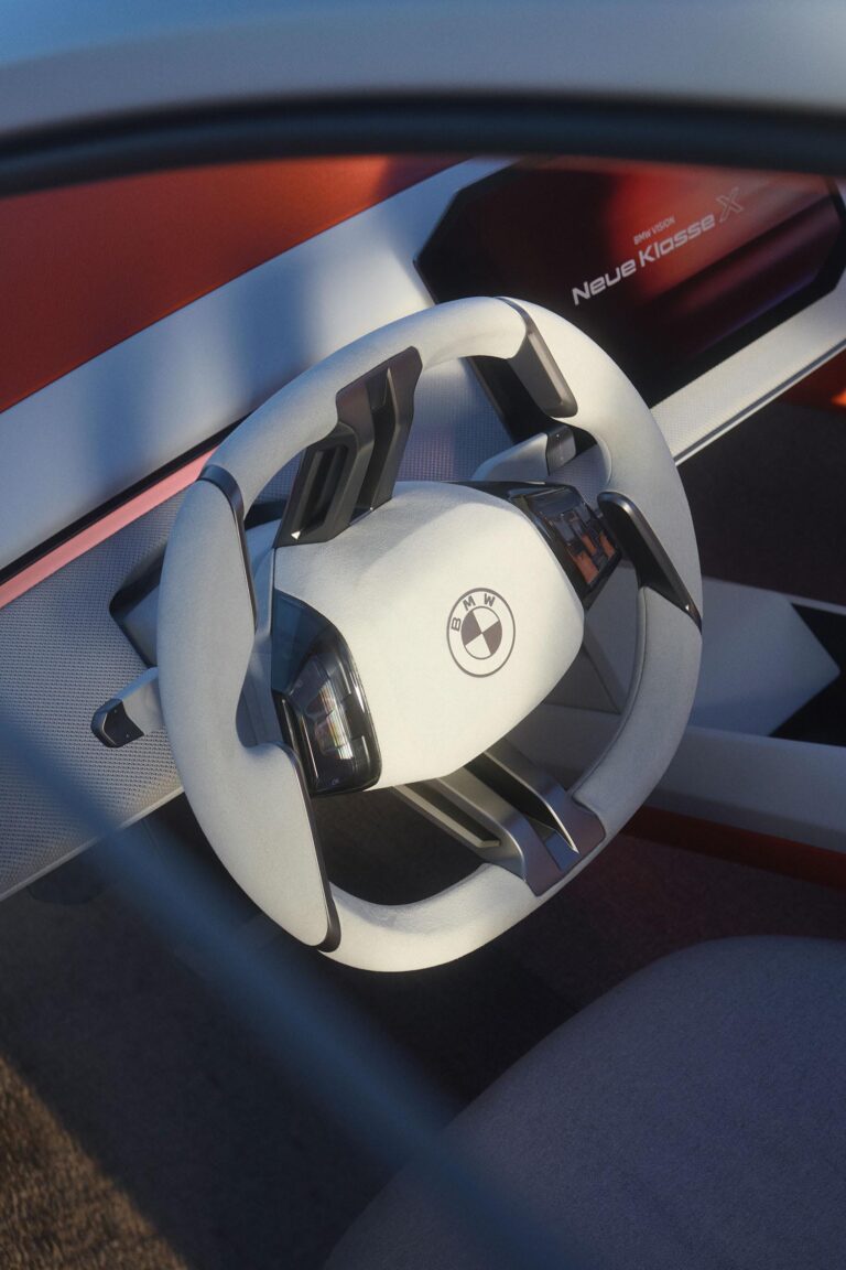 Nagy lehet a fejvakarás, hogyan találják meg az optimumot a praktikus és légellenállási szempontból is legkedvezőbb formájú kilincsek között. Pedig mennyire szerettük a vaskos, jól megmarkolható régi BMW-kilincseket! A mostani autókon a karosszériába simuló nyitófülek nem állnak kézre, de kisebb a légellenállásuk. A Vision Neue Klasse nem is kapott hagyományos kilincset, az ajtóba épített érzékelő előtt kell integetni, ha be akarunk jutni. Az X most egy fokkal közelebb került a földhöz, pici kallantyú lóg ki az övvonal fölött, ezzel lehet nyitni az ajtókat. A másik fontos elem, ami még biztosan változni fog, az a kamerás visszapillantó. Mivel a beltérben nem tudják optimálisan megoldani a monitorok elhelyezését, egyelőre lemondanak a kamerákról. Talán jobb is így.