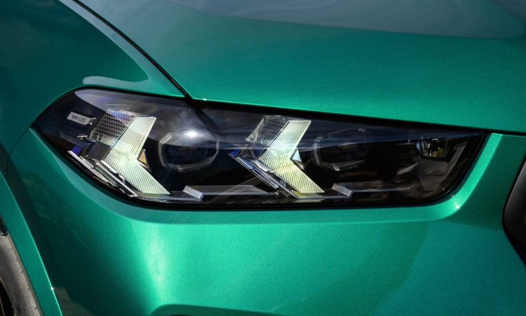 Egész pontosan 35 milliméterrel szűkebben néznek a mátrix LED-es fényszórók, melyeknek menetfénye messze eltávolodott az E39-es 5-ös sorozaton bemutatkozó körhelyzetjelzőktől. A menetfények már sokkal inkább a nyílvessző hegyére hasonlítanak, mely szintén szúrós tekintetet ad az X5 M-nek és a lecsapott tetővonalú X6 M-nek. (Csak csendben jegyzem meg, hogy szerintem rettenetesen kínos, hogy mindez a Kia Ceed nappali menetfényére hasonlít leginkább.)