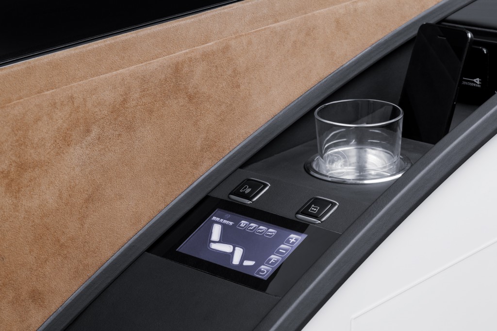 A két ülés között elhelyezett középkonzolon két kisebb, tíz colos képernyőt találunk (mármint nem mi, hanem akik meg tudják fizetni), alatta kávéfőzővel és mini hűtővel. A kocsiban emellett van minibár is, valamint ülésenként egy-egy kihúzható kis asztal.