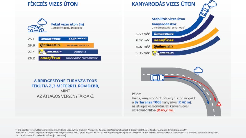 Az egyik az objektív, amikor felkérték a német TÜV intézetet, hogy hasonlítsa össze alaposan a konkurensekkel, és azon a teszten az jött ki, hogy a T005 vizes úton fékezésben és kanyarodásban is jobb, mint a Continental, a Goodyear, a Michelin és a Pirelli abroncsai. A címkebesorolása, ami alapján a vevők rögtön látják, milyen termékkel van dolguk, A lett a vizes úton viselkedésre, és B az üzemanyag-takarékosságra.