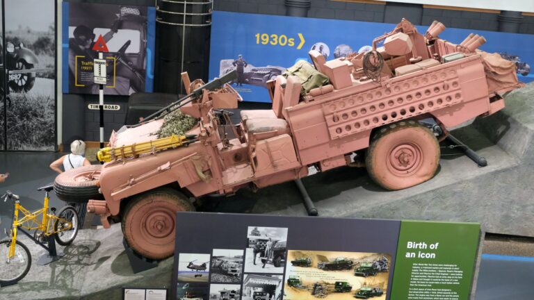 A rózsaszín Land Rover nem filmes autó, hanem egy teljesen komoly katonai jármű, az SAS sivatagi egységének szállított modell. A rózsaszín festés jól beolvad a sivatagi homokba, szóval bármilyen feltűnő is ez a gép a múzeumban, valójában ez egy álcázott kocsi