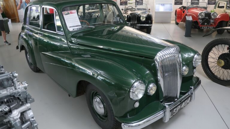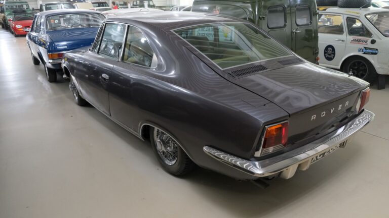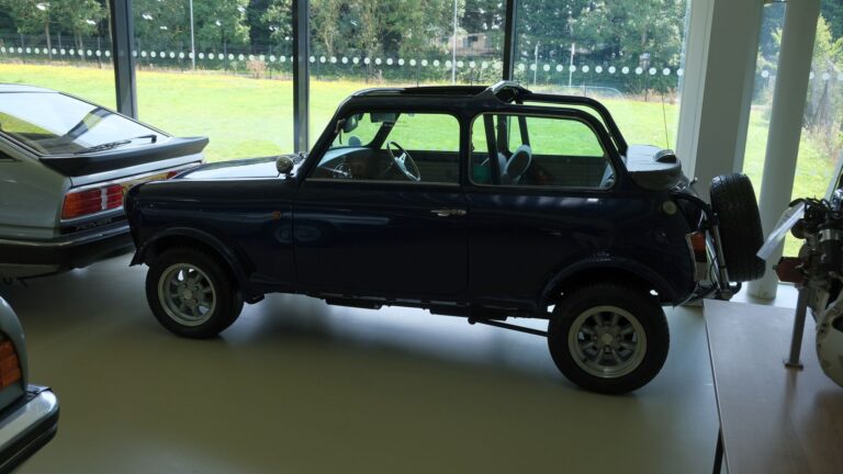 Nagyon jól tettük, hogy csatlakoztunk a kis csoporthoz. Különben biztosan simán elsétáltam volna azok mellett a szemre nem túl izgalmas kocsik mellett, amelyek sorsa komoly fordulópontot jelentett, vagy sajnos inkább csak jelenthetett volna a nagy brit márkák, gyártók sorsának alakulásában, vagy amik különlegesen érdekes sorsuk miatt lettek egyedi darabok. Mint az a Morris Minor, ami még a háború utáni acélínségben készült mindenféle trükkös nyersanyagspóroló megoldásokkal, és 1961-ben került vissza a gyártó múzeumába, amikor az egymilliomodik legyártott példányt keresték egy olyan akcióval, hogy aki a legöregebb Minort viszi be hozzájuk, kap érte cserébe egy újat. Így lett meg nem csupán a legöregebb, de a legelső darab!