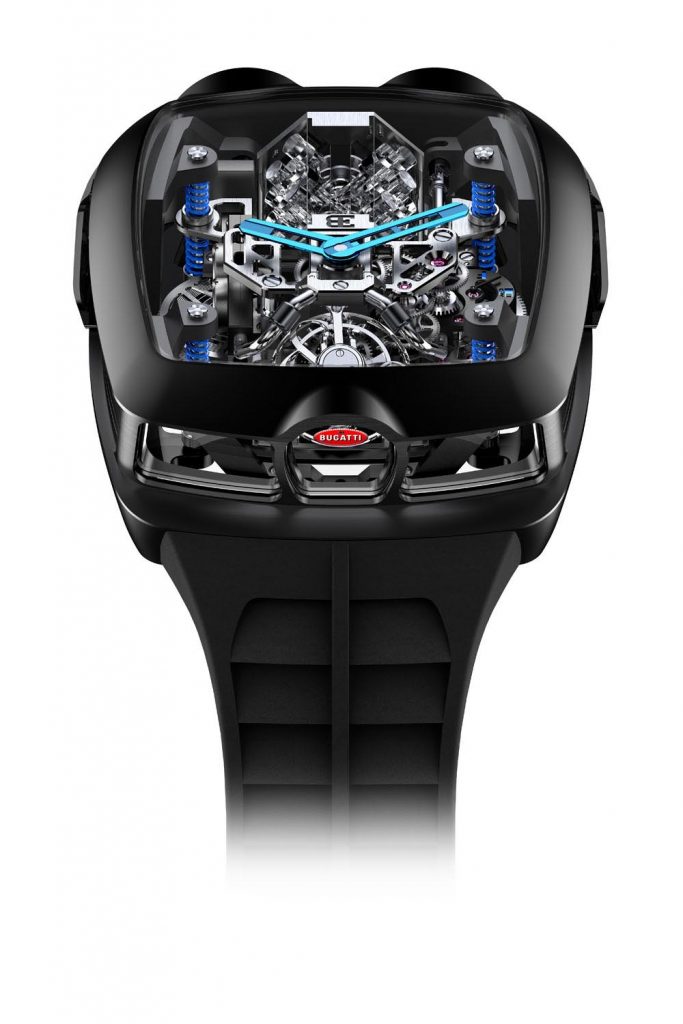 Az 578 apró alkatrészből álló motort megforgatni az órán lévő gombok egyikével lehet. Az egyetlen különbség, hogy az óra motorjában csak két turbótöltő kapott helyet, a Bugattinak pedig négy van, de ez legyen a legnagyobb baj.