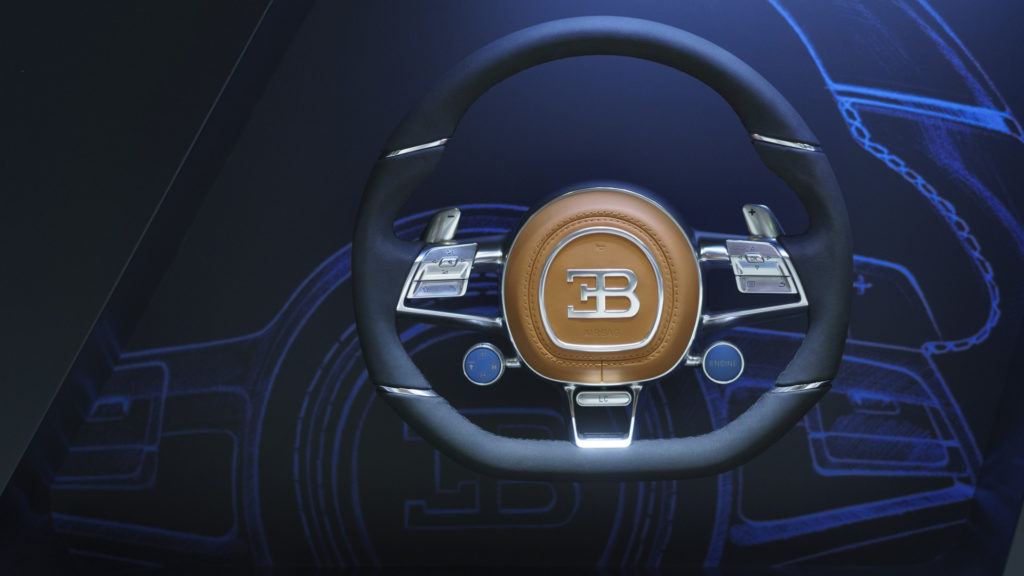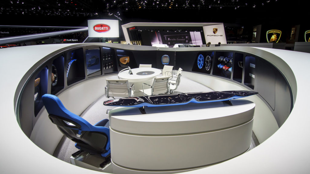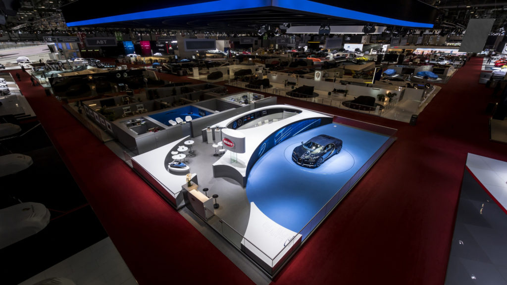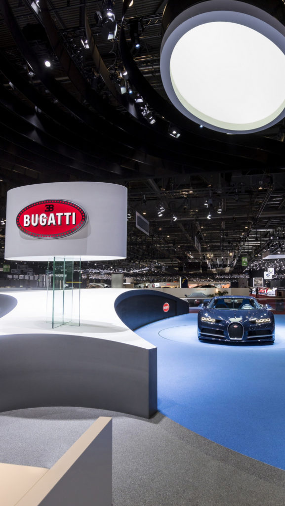 A Bugatti csak egy autót, egy Chiront állított ki, a stand mégis grandiózus volt. A zsűri külön értékelte a kiállítótér elegáns vonalait és profi megvilágítását. A felülnézeti képen jól látszik, hogy a Bugatti emblémája, amit egyébként macaronnak hívnak, adta a formát az egyes részletek kivágásához. A standon még egy elkerített lounge is helyet kapott a jelenlegi és leendő ügyfeleknek.