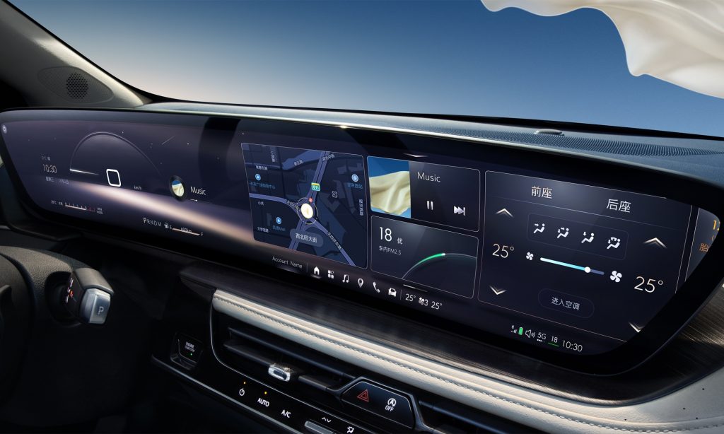 Utasterét a egyértelműen uralja a műszerfalból kiemelkedő 30 colos érintőkijelző.