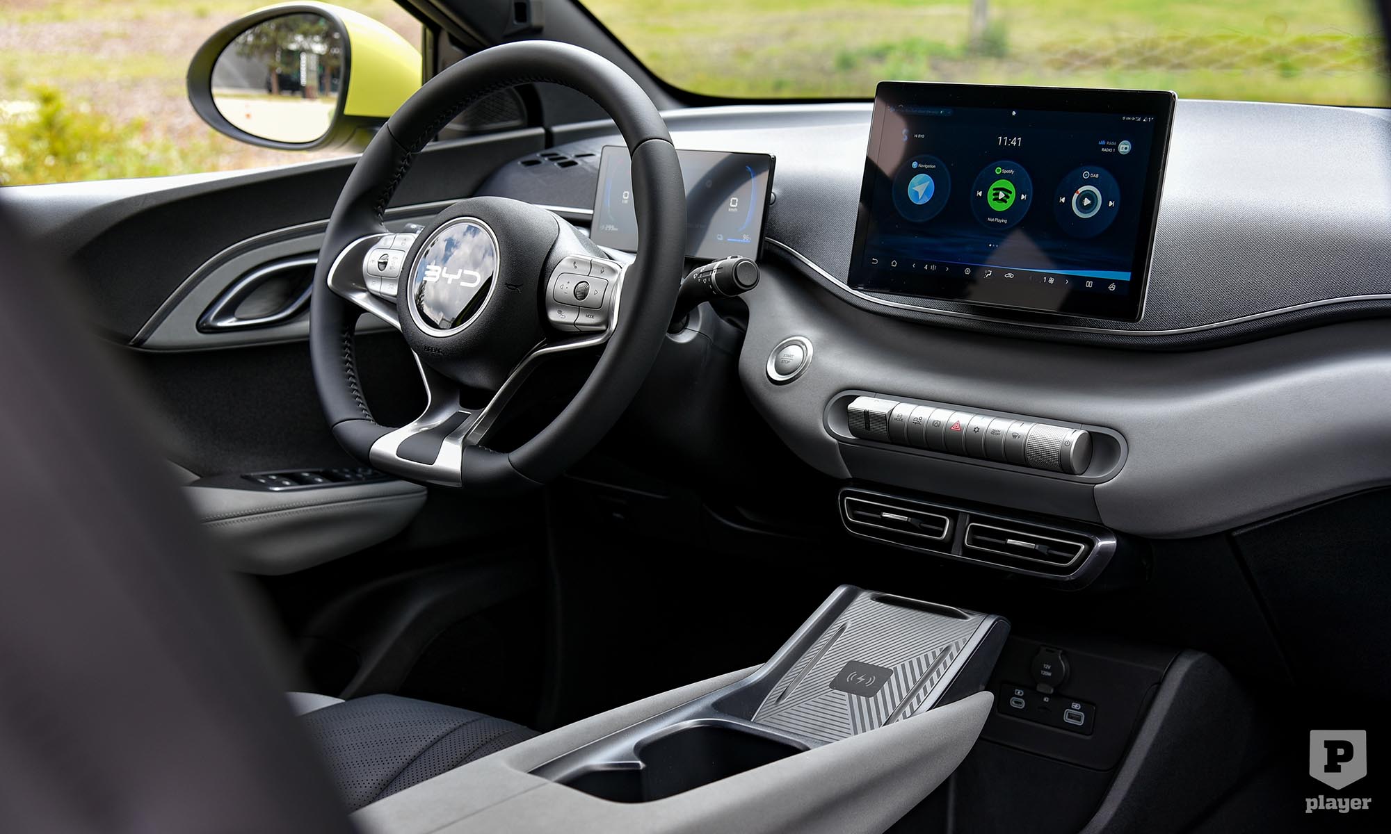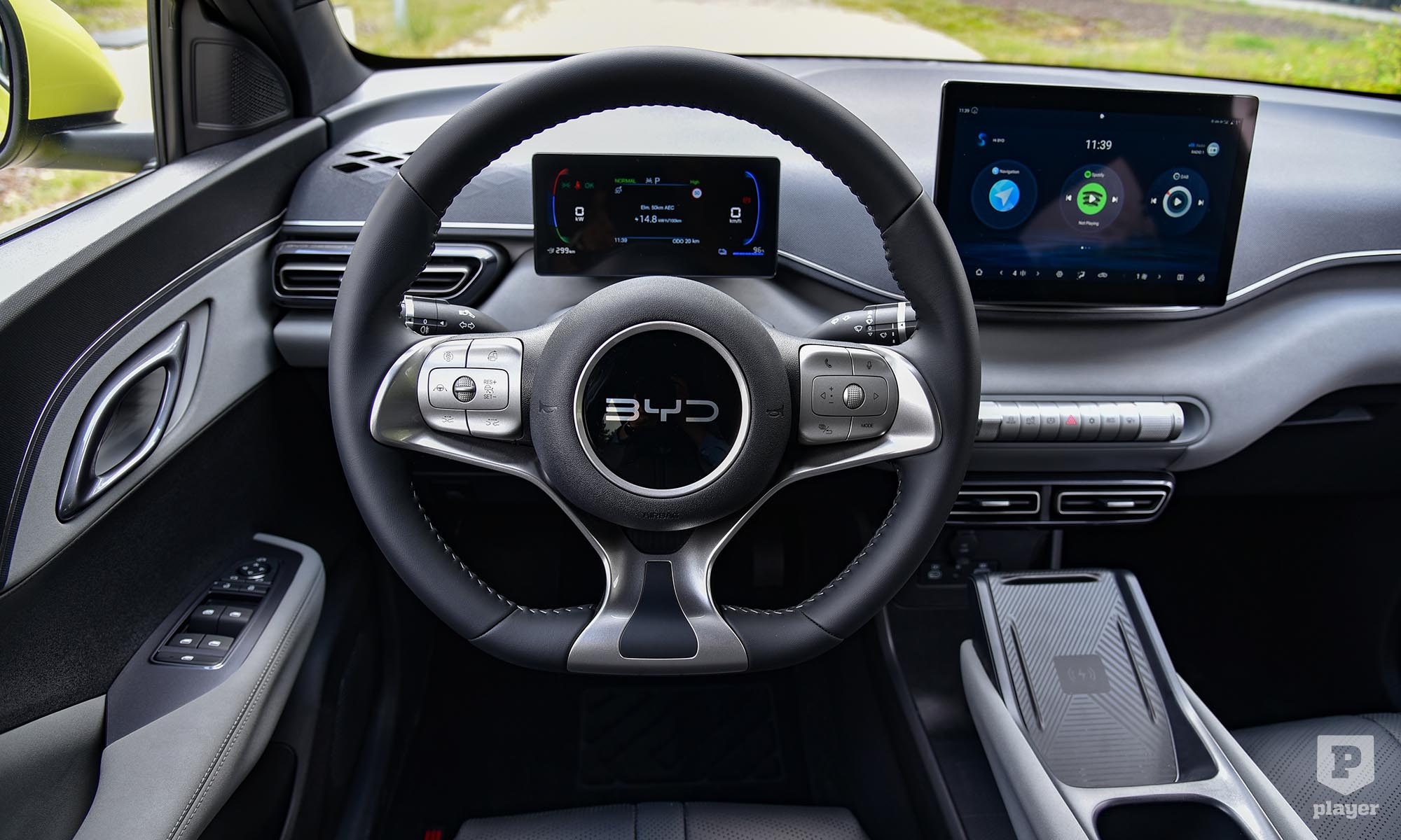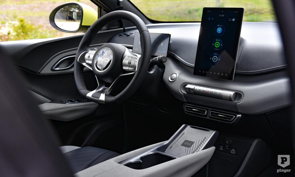 Bent a nagyobb BYD-modellekből ismerős organikus dizájnnal találkozunk, a digitális műszerfal része a kormánykerék mögötti 7 colos műszeregység és a középre tett érintőképernyő, ami ebben a kisautóban valamivel kisebb, de 10,1 colos mérete teljesen elegendő, és a többi BYD mintájára fekvőből álló tájolásba fordítható, akár hangvezérléssel is, néhány funkciónak pedig megmaradt a hagyományos gombja a képernyő alatt.