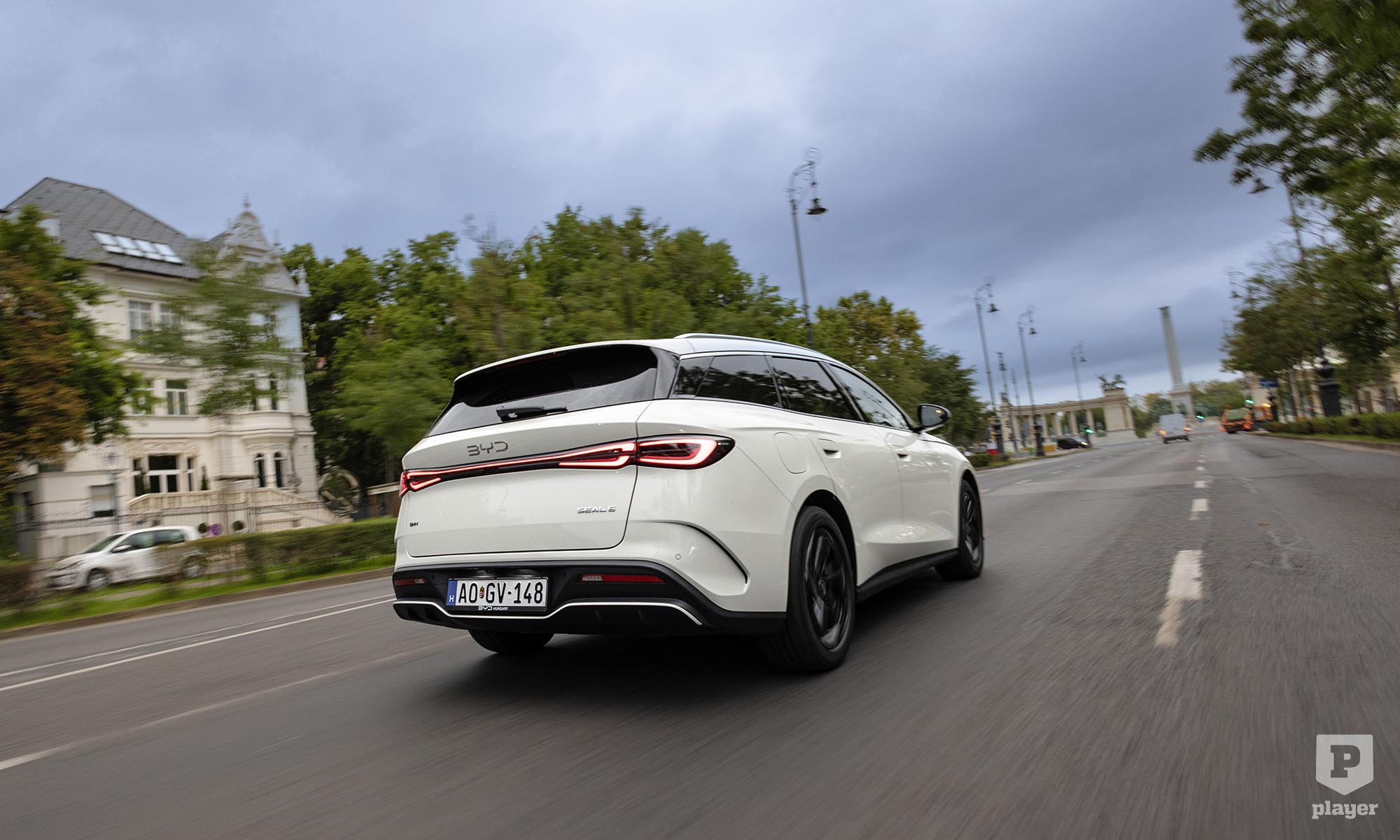 Míg a Seal formája kívánatos, a Seal 6 kombi inkább kellemes. Egyáltalán nem néz ki rosszul, de a hasonlóan konfliktuskerülő dizájnt választó márkák közül gyakorlatilag bármelyik emblémáját rá lehetne biggyeszteni. A letisztultnál nem jut jobb jelző az eszembe, és ha megnézem a sokkal karakteresebb BYD Dolphin Seal karosszériáját, nem is bánom, hogy nem jutott neki több egyéniség. Magasan fut az övvonala és kicsit farnehéz a dizájn, mert ez nem sportkombi, hanem egy rendes, alaphelyzetben is 500 literes a csomagtartója.