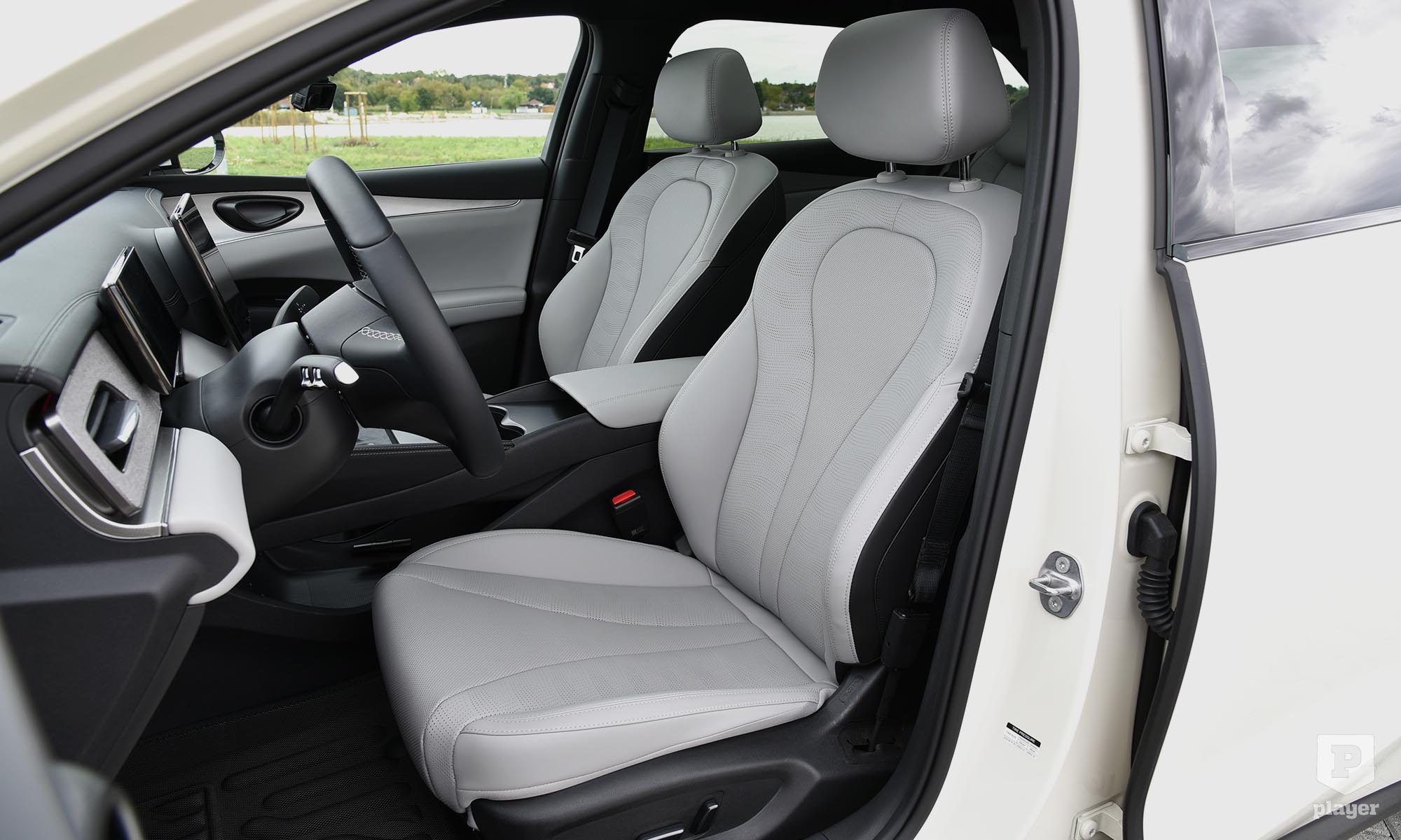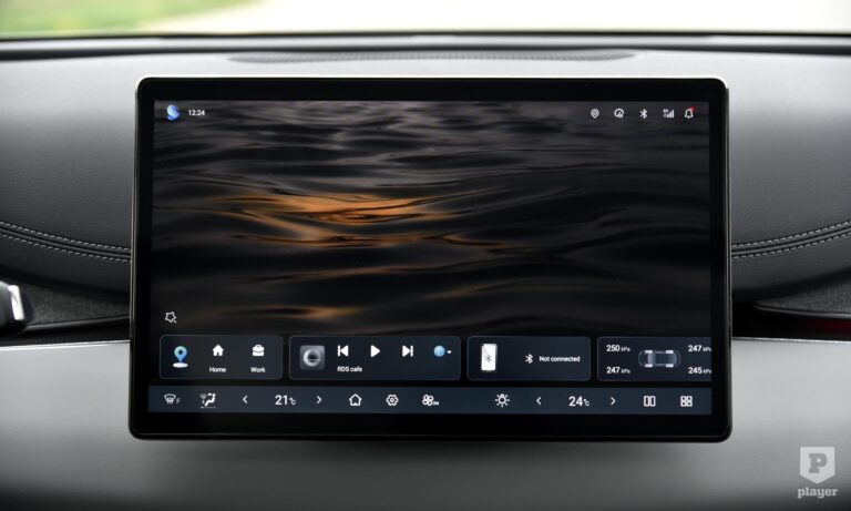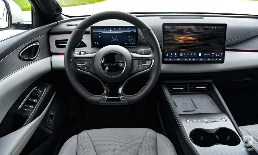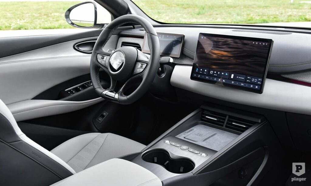 A műszerfal modernebb, mint a BYD külseje, ennek előnyeivel és hátrányaival. A nagy, fényes, fekete közepével a kormány a leggyengébb esztétikai elem, de legalább valódi gombok vannak rajta, nem simogatósak. Mögötte 8,8 colos kijelzőn láthatjuk a legfontosabb információkat, a középső monitor a Comfort szintű tesztautón 15,6 colos, a szerényebb – és a névvel ellentétben gyengébb – Boostnál 12,8 colos. Nem forgatható függőleges pozícióba, ahogy azt a BYD-knál már-már megszoktuk, szerencsére csak annyira hiányzik ez a funkció, mint a tankból a porcukor.