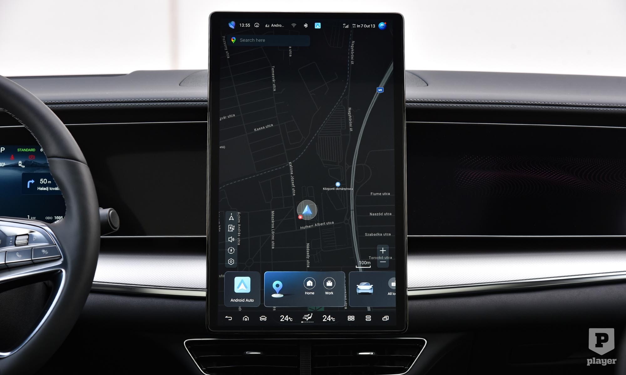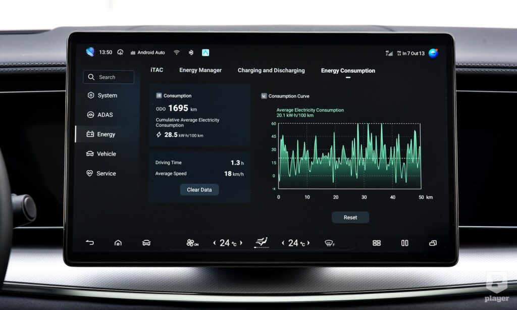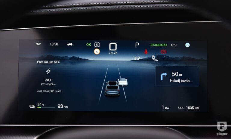 Az is látszik, hogy a navigáción és a fedélzeti rendszeren folyamatosan javítanak. Ebben már lehet nullázni a fogyasztásmérőt, de csak 50 kilométeres szakaszra tud átlagfogyasztást mérni. Jobb lett a navigáció is, tervezett töltési pontokat hosszabb útra, használja a Google adatbázisát a pontos helyek meghatározására, de annyira még nem okos az útvonaltervezés, mint mondjuk a Teslánál.