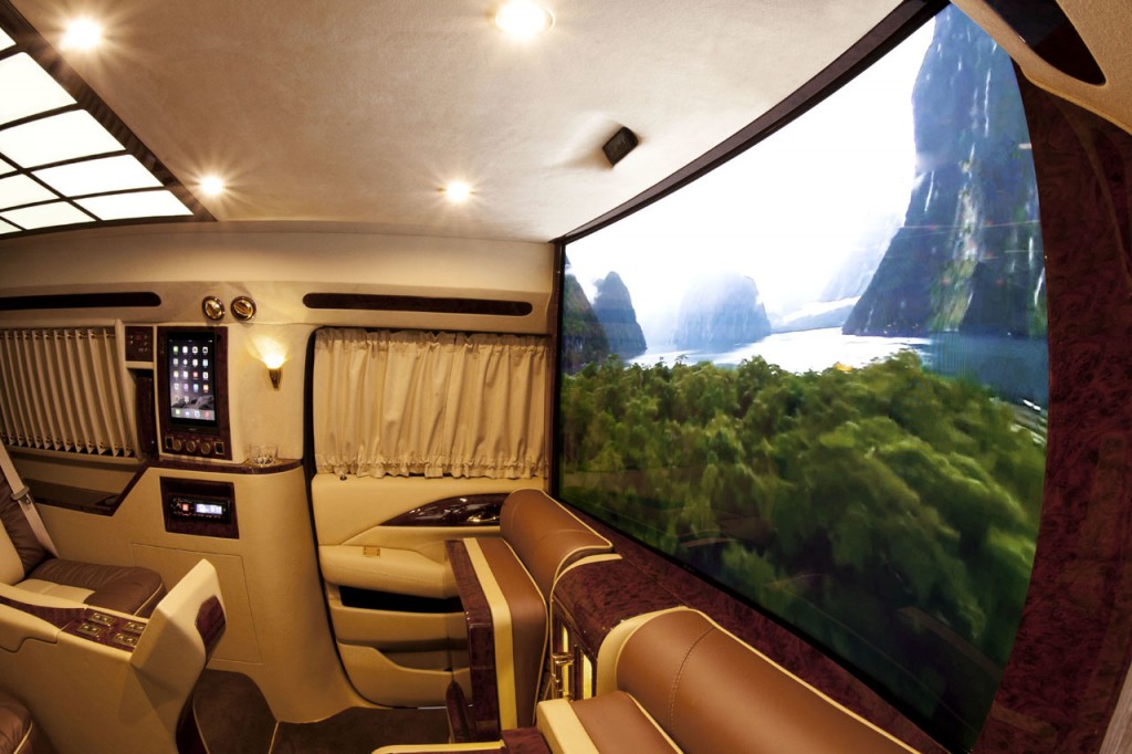 Elég komolyan vették a feladatukat: a kétszemélyes mozi akkor is lenyűgöző lenne, ha egy házban alakították volna ki, nem egy batár SUV-ban.
