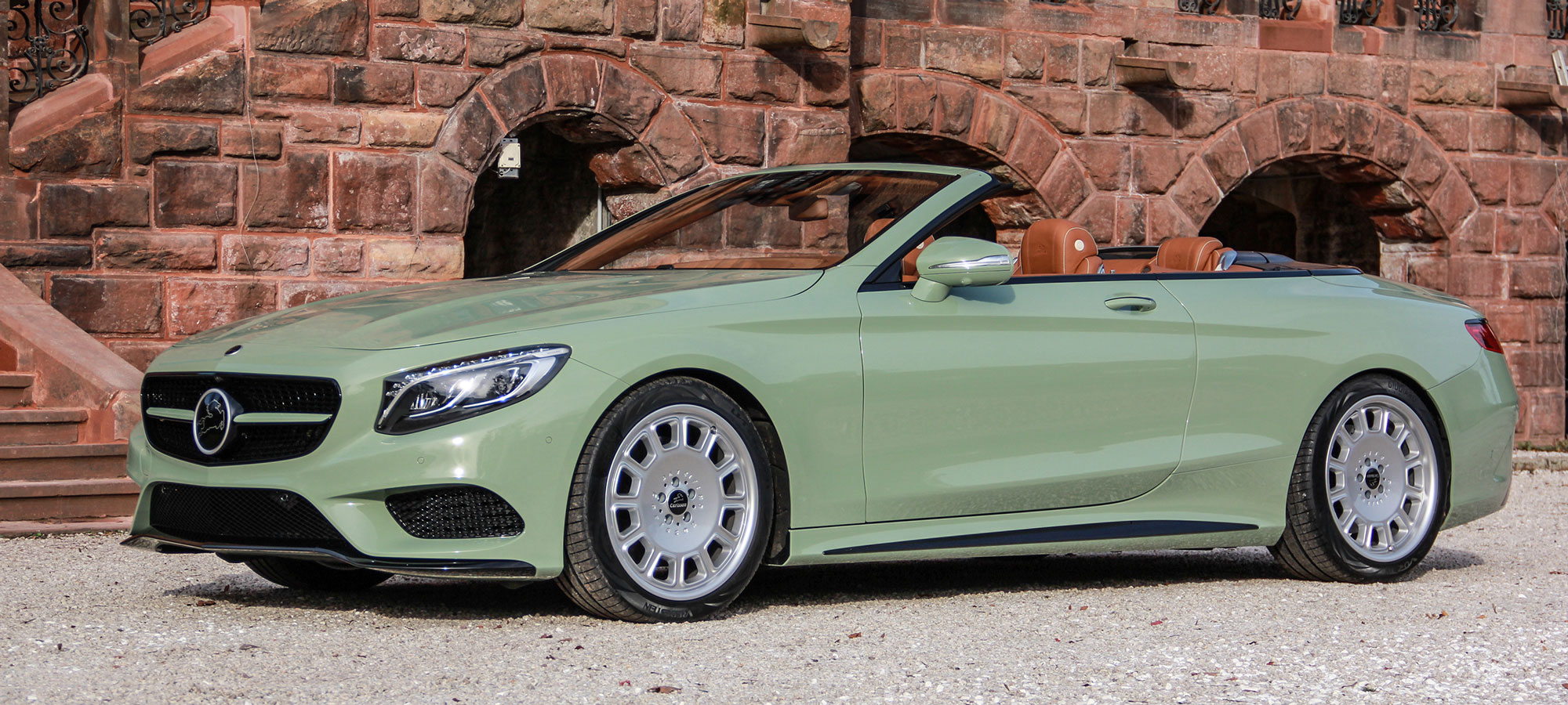 Kétségkívül egyedi lett a Carlsson által átépített S-osztály Cabriolet. A vászontetős kabrió már szériaváltozatában is előkelő megjelenésű, de ebben a fogkrém-zöldben még különlegesebben hat. Főleg annak, aki kevésbé ismeri a típust, a Carlsson ugyanis az összes Mercedes-emblémát leszedte, a helyét a tuningcég ágaskodó paripája vette át.