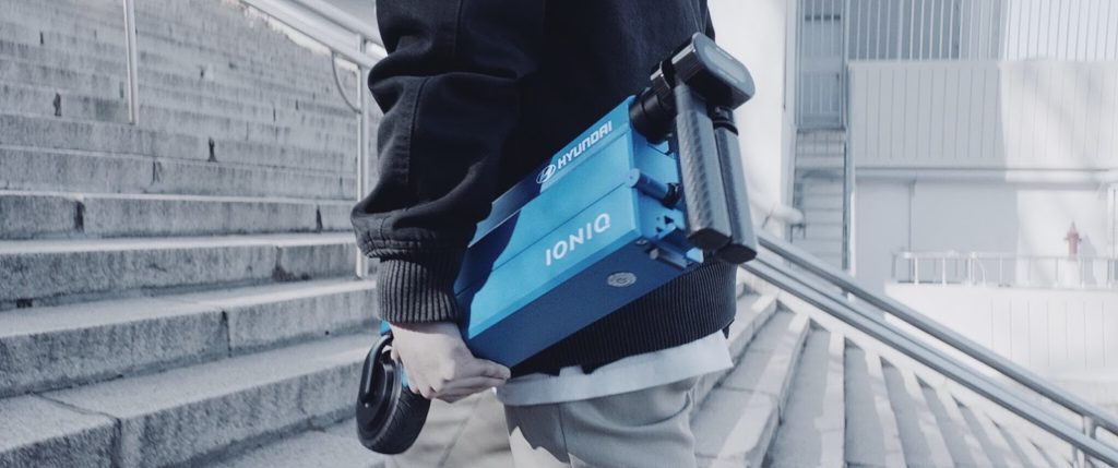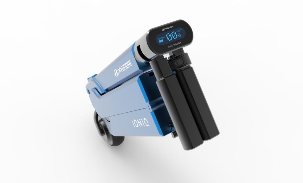 Egy kevésbé futurisztikus, de annál hasznosabb ötlettel rukkolt elő a Hyundai. Az Ioniq elektromos vagy hibrid modellhez tervezett összecsukható elektromos rollerről van szó, ami olyan kicsire összecsomagolható, hogy elfér az első ajtóban, és olyan könnyű, hogy egy kézben, a hónod alá csapva is magaddal viheted.