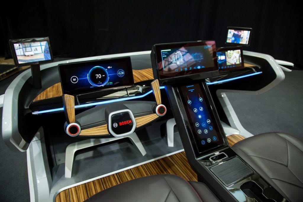 A Bosch koncepcióján is már csak jelképes a kormánykerék, tulajdonképpen két fogantyú, ellenben a műszerfal úgy néz ki, mint egy hardcore gémer játékkonzolja.