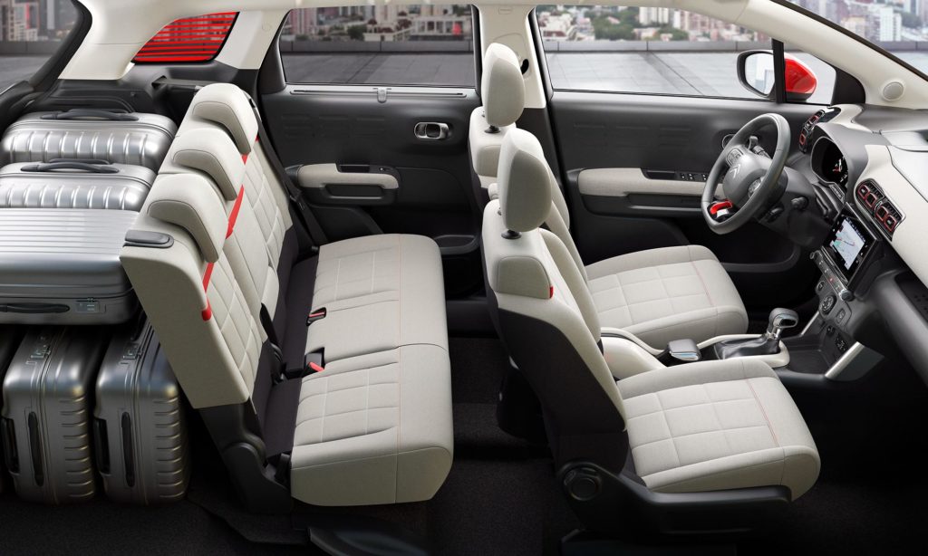 De belül lényegesen nagyobb a C3-nál jóval magasabb Aircross. Az első ülései hasonlóan szélesek, a hátsókat pedig két részre osztották, amiket egyenként lehet sínen tologatni, a csomagtér mérete így 410 és 520 liter között lehet. A jobb első ülés ledöntésével 2,4 méter hosszú cuccot is vihetsz.