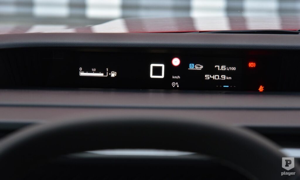 A jó ötletek közé tartozik, hogy a kicsit lapított kormány mögötti kijelző tulajdonképpen nem is a kormány mögött, hanem fölötte helyezkedik el, gyakorlatilag egy head-up display, csak nem a szélvédőre vagy egy lapkára vetít. A lényeg, hogy csak kicsit kell lejjebb nézni az útról menet közben.