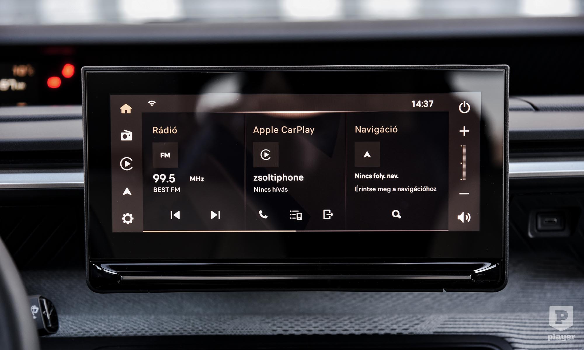 Az elektromos változathoz nem kérhetők pótülések, így viszont öt – főleg persze négy – személy normálisan elfér, hátul is van fej- és lábtér, úgy, hogy a csomagtartó is tisztességes méretű, 460 literes. A műszerfalra is jutott ötlet – és ebben a változatban érintőképernyő is –, a sebességet, a hatótávot és az akkutöltöttséget a legjobb helyen, a vezető előtt, magasan találjuk. A lapított kormány nem jó, ha manőverezni kell, de legalább biztosan nem takar bele a kijelzőbe. Van külön klímapanel, ahonnan az ülés- és kormányfűtés is vezérelhető, a sávtartó és a táblafigyelő is gombbal iktatható ki, nem a nagyon egyszerű, alig néhány szintből álló menüből. A műszerfal elrendezése is érdekes, ami nem felesleges dizájnkodást jelent, a szövetborítás rengeteget dob az egyébként is barátságos hangulaton. Tehát az utastérben is célt értek a tervezők.