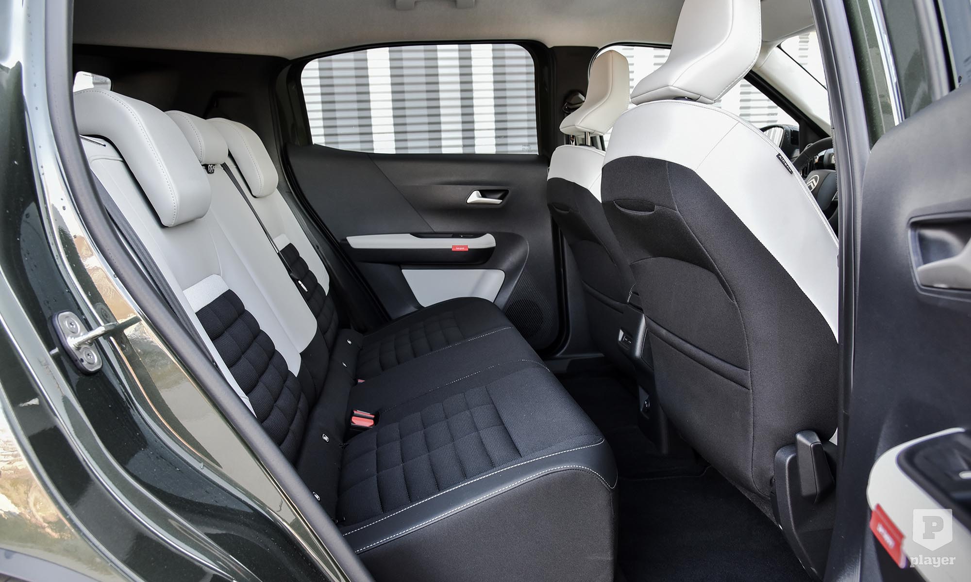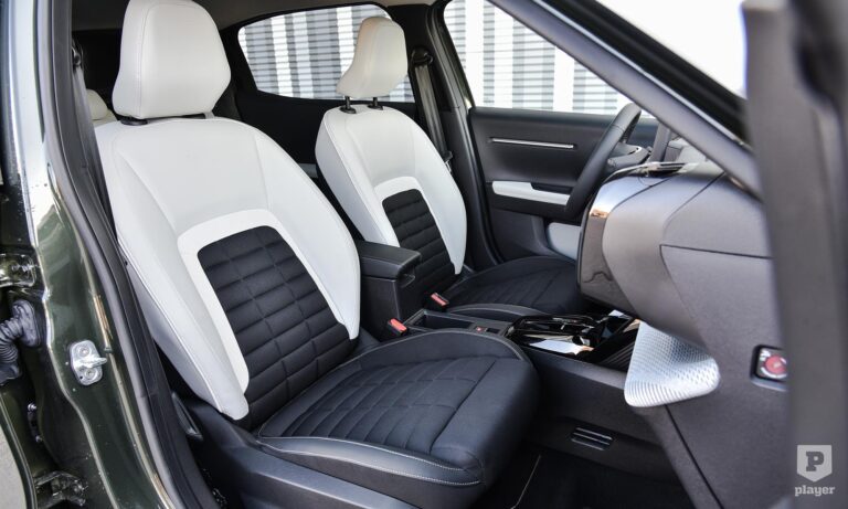 De még a Maxban is kényelmetlen az ülés, mert a derekat nem támasztja – külön deréktámasz nincs – a túlságosan előrehajló, csak magasságban állítható fejtámasz miatt pedig az egészségesnél hátrébb kell dönteni az üléstámlát. Nemcsak kulcs nélküli indítás nincs, hanem kulcs nélküli ajtónyitás-zárás se. Töltésnél csak a hátralévő időt jelzi, az aktuális töltési teljesítményt nem, ahogy a fogyasztást sem írja ki sehol. A stellantisos irányváltó kapcsolót néha egyszer, néha kétszer kell billenteni, hogy P-ből vagy R-ből N-en át D-be, vagy D-ből R-be kapcsoljunk, gyakran előfordul, hogy nyomjuk a pedált, de sík területen nem történik semmi, mert üresben vagyunk, lejtőn pedig a fizikai törvényeknek megfelelő irányban gurulni kezdünk.