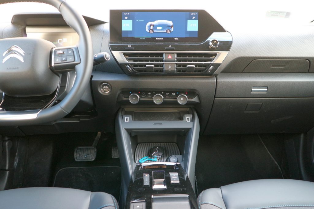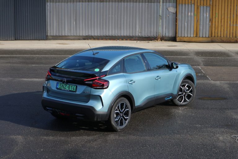 A technikáról nem írnék regényt, ennél ismertebb európai villanyautó-hajtáslánc ma talán nincs is. Az ë-C4 50 kWh-s akkuját, 100 kilowattos, 136 lóerős motorját Corsától Jumpyig mindenbe beépíti a Stellantis. A rendszer gyenge pontja az alapkivitelben csupán 7,4 kW-os, de feláréárt már 11 kW-os váltóáramú töltés. Az 50 kW-os gyorstöltési lehetőség a hazai töltőhálózatban elegendő, hiszen ennél nagyobb teljesítményt nem sok helyen lehet felvenni a nyilvános töltőhálózaton.