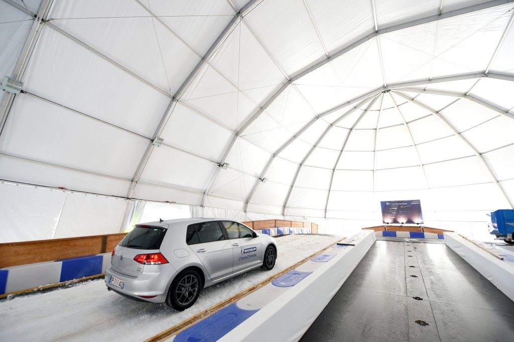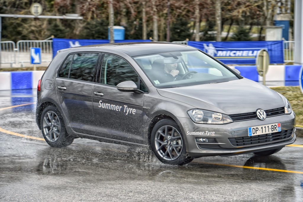 A tesztvezetés aztán kisimította a homlokunkra kiülő ráncokat. Jómagam először egy négy évszakos abroncsokkal szerelt Volkswagen Golffal csapattam végig a pályán, ami három próbából állt. Az első egy sima gyorsítás-fékezés száraz aszfalton, a második fokozatos gyorsítás egy vizes körforgalomban, végül azt néztük meg, hogyan repeszt az autó csutkagázzal egy havas emelkedőn.