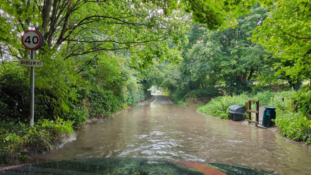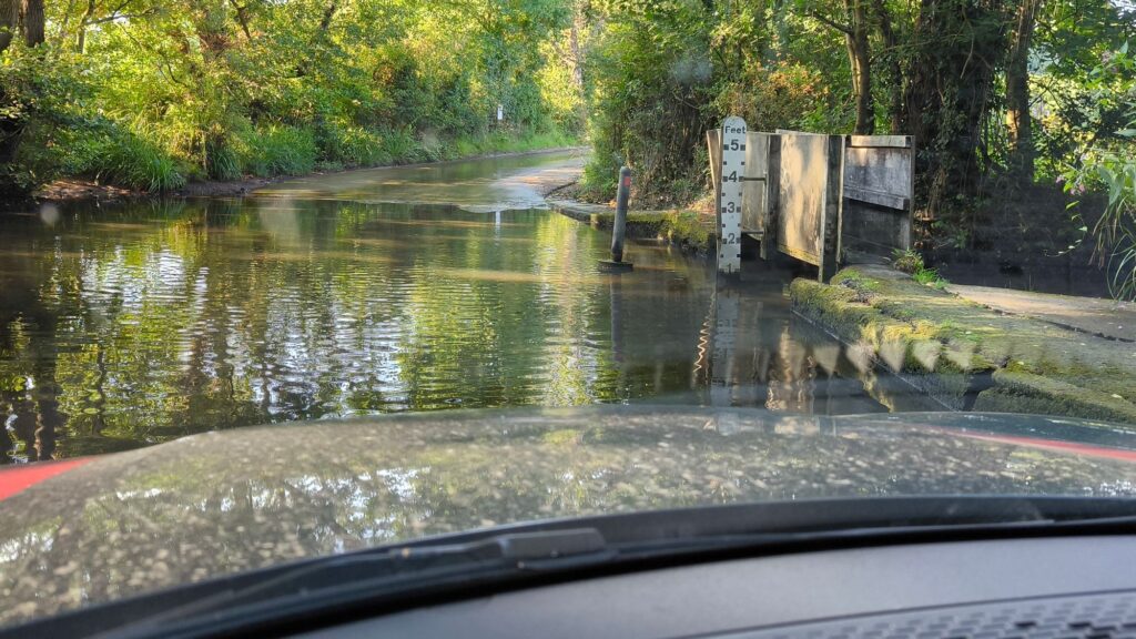 A véletlenek sima vidéki utak voltak közép-Angliában, amelyeket épp elöntött egy kicsit a víz. Ezek a jellemzően „flood” jelzéssel is előjelzett átfolyások gyorsan eltűnnek, miután elállt az eső, de ha sietünk, szerencsés esetben vízmélységjelző segít eldönteni, mikor mehetünk át. Csak ne felejtsük el átszámolni az adatot lábból: