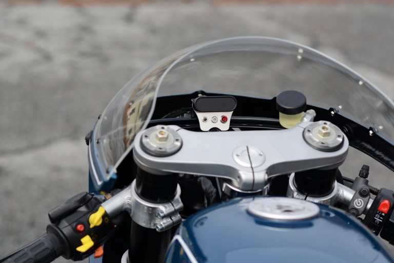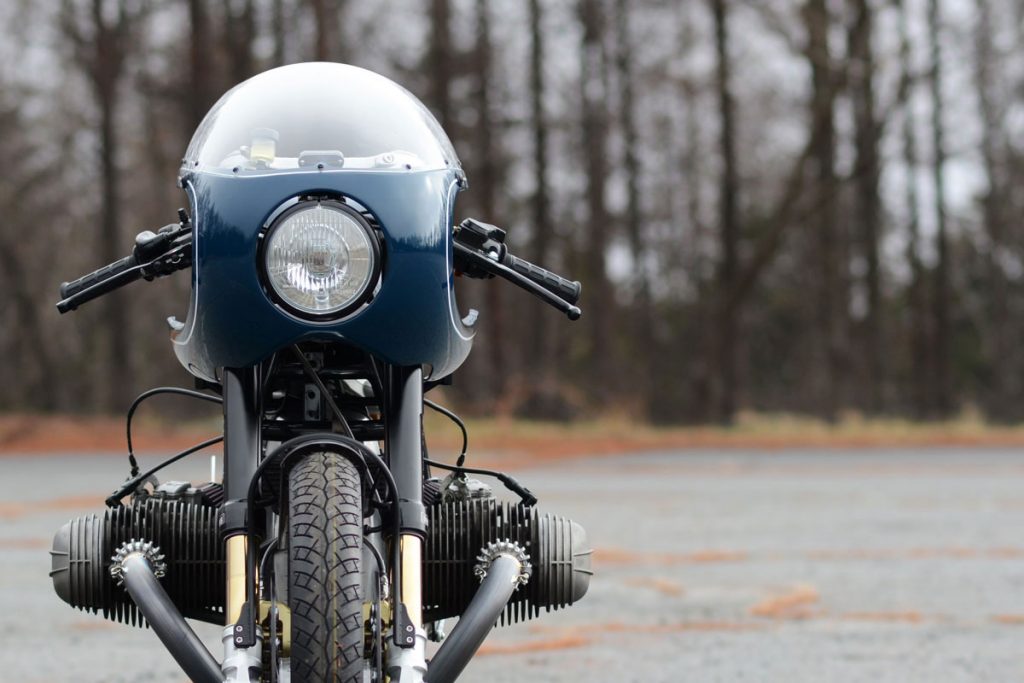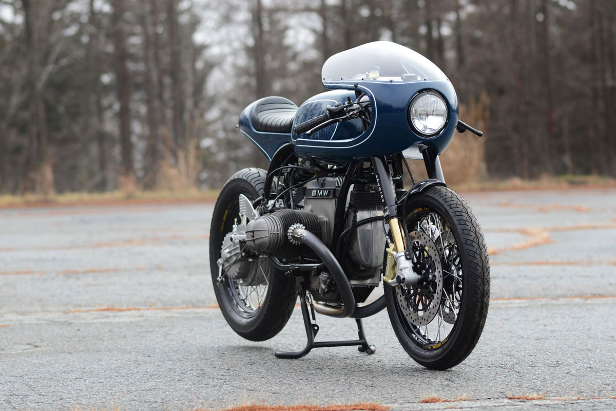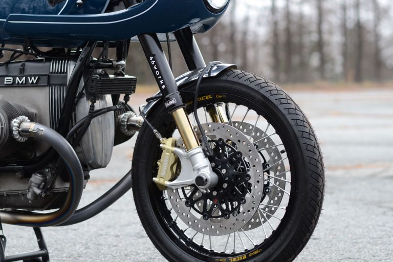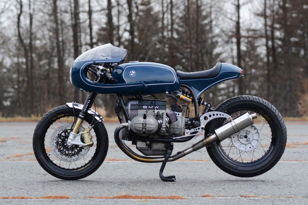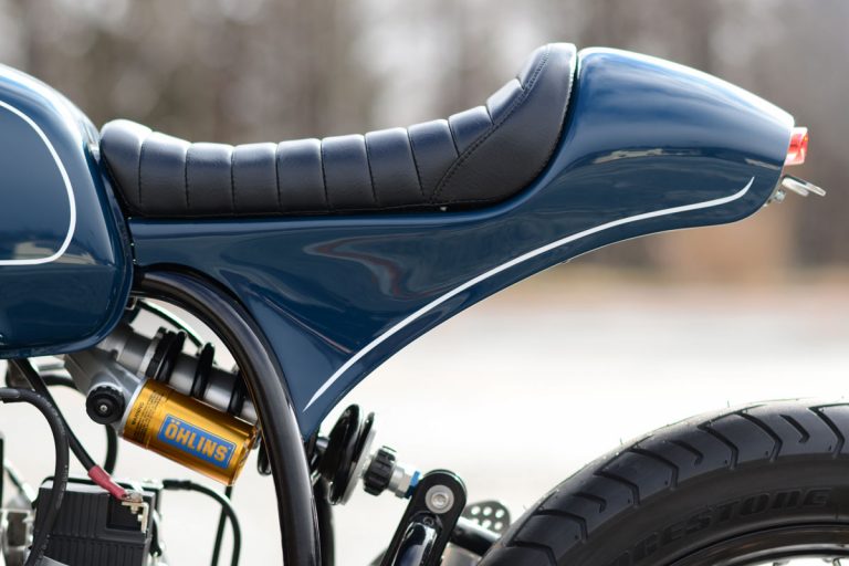 A klasszikus kék fényezéssel és a hajszálvékony fehér csíkokkal lett igazán tökéletes a 46works által épített, 980 köbcentis bokszermotorral szerelt BMW café racer megjelenése, amiből csak ez az egy példány épült. Nagyon szívesen látnánk a garázsunkban.