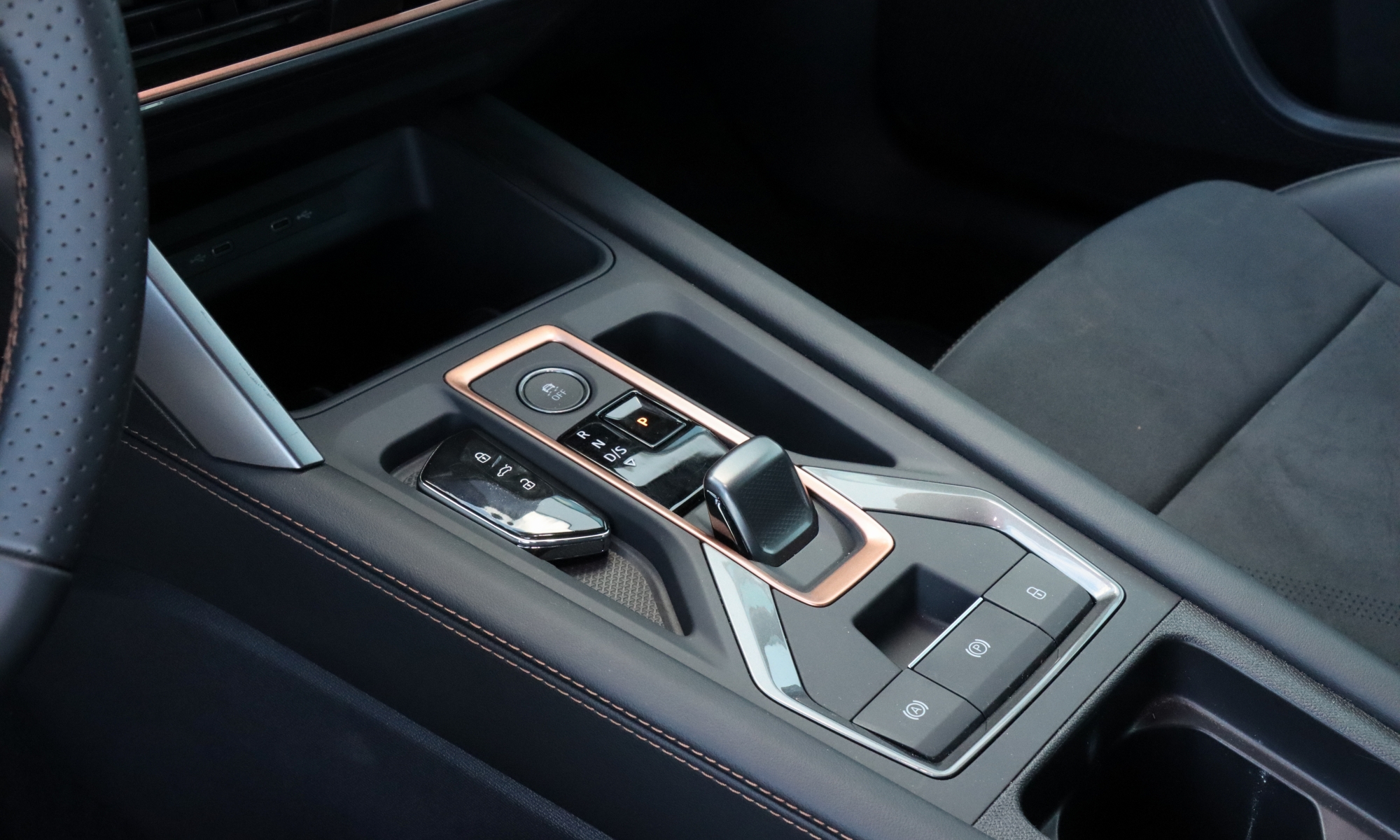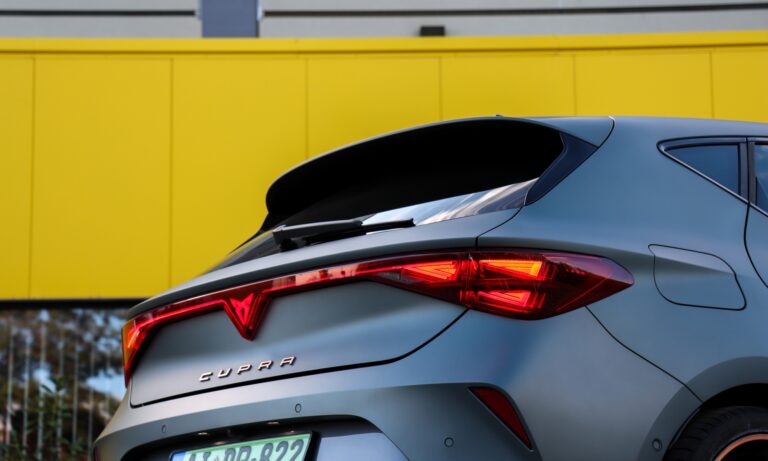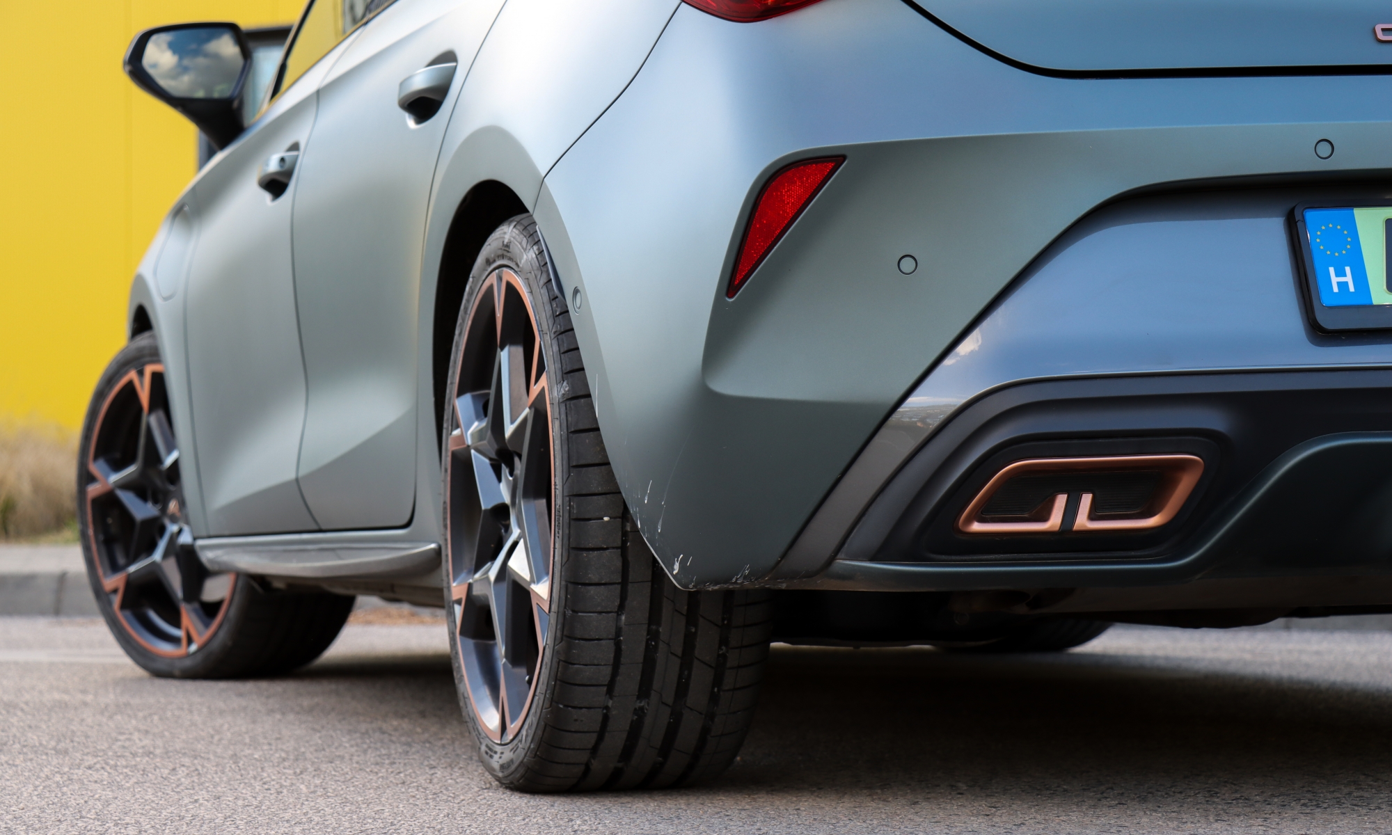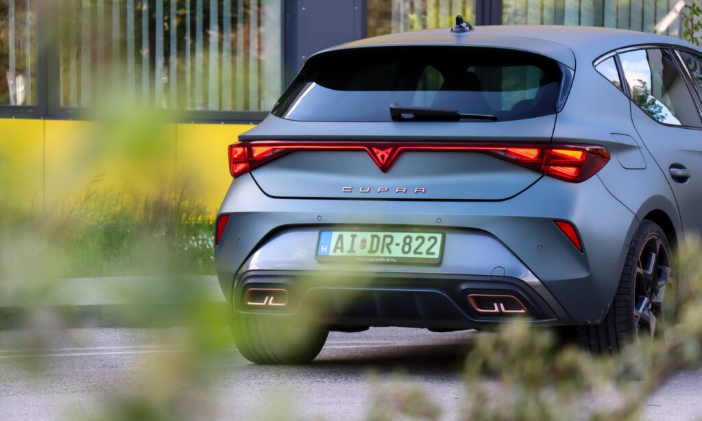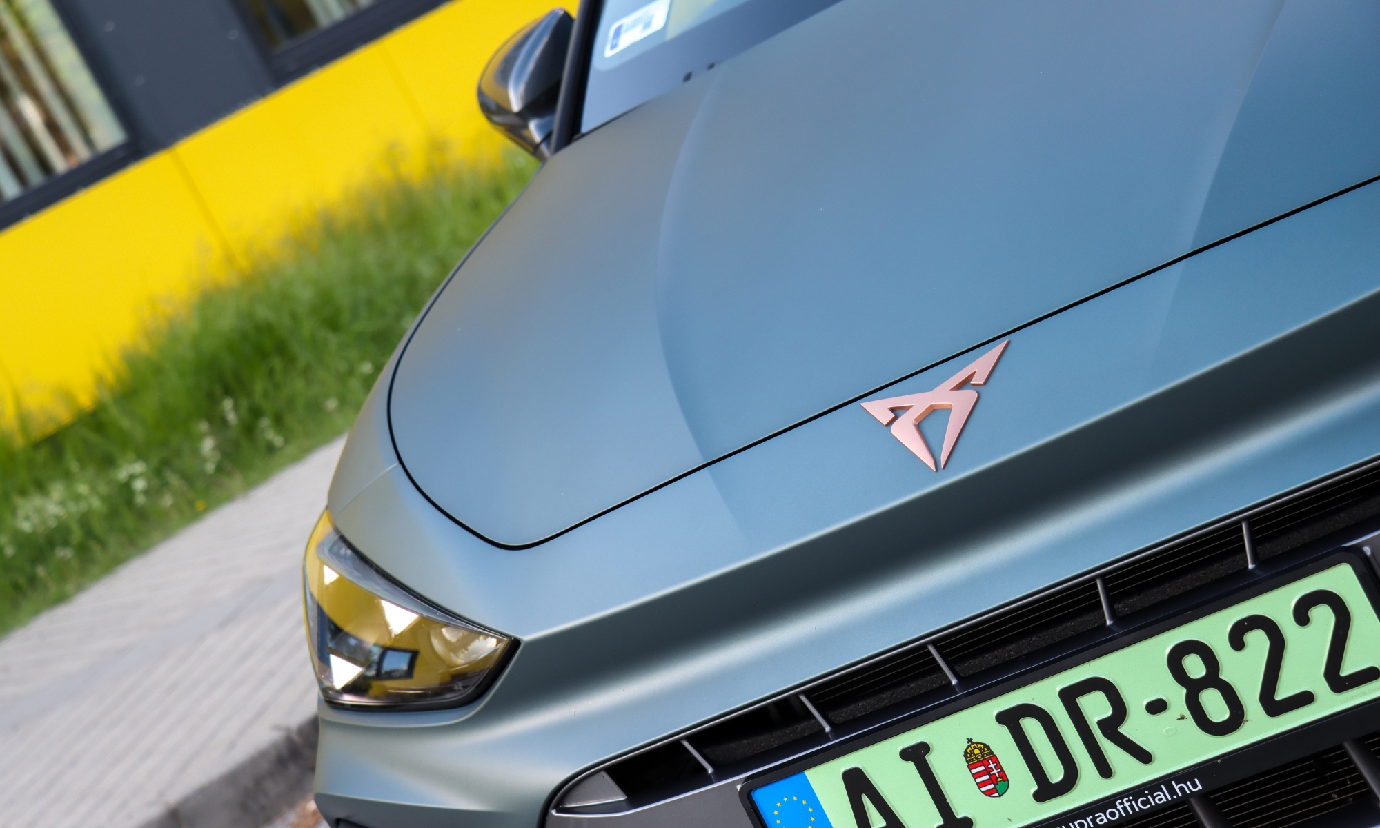 Elképesztően jó kiállása van a plug-in hibrid Cupra Leonnak a nagy felnikkel és a látványosan ültetett sportfutóművel, tényleg megvan benne az a dögös útra feszülés, ami a vérbeli hot hatch-ek egyik alapmotívuma. A frissítéssel együtt hatalmas hűtőmaszkja és pörölycápa orra lett a Cupra Leonnak, amiben bőven van határozottság, de kevesebb a harmónia. Már a Cupra Formentor VZ5-ön is imádtam, de itt is nagyon betalálnak a réz színű és szürke betétek, remekül passzolnak a matt zöldes fényezéshez. A tisztán benzines verzión négy kipufogóból dörmög a 2.0 TSI, ezen viszont csak halvány utalás van a kipufogókra, a töltő csatlakozója pedig bal első sárvédőben van.