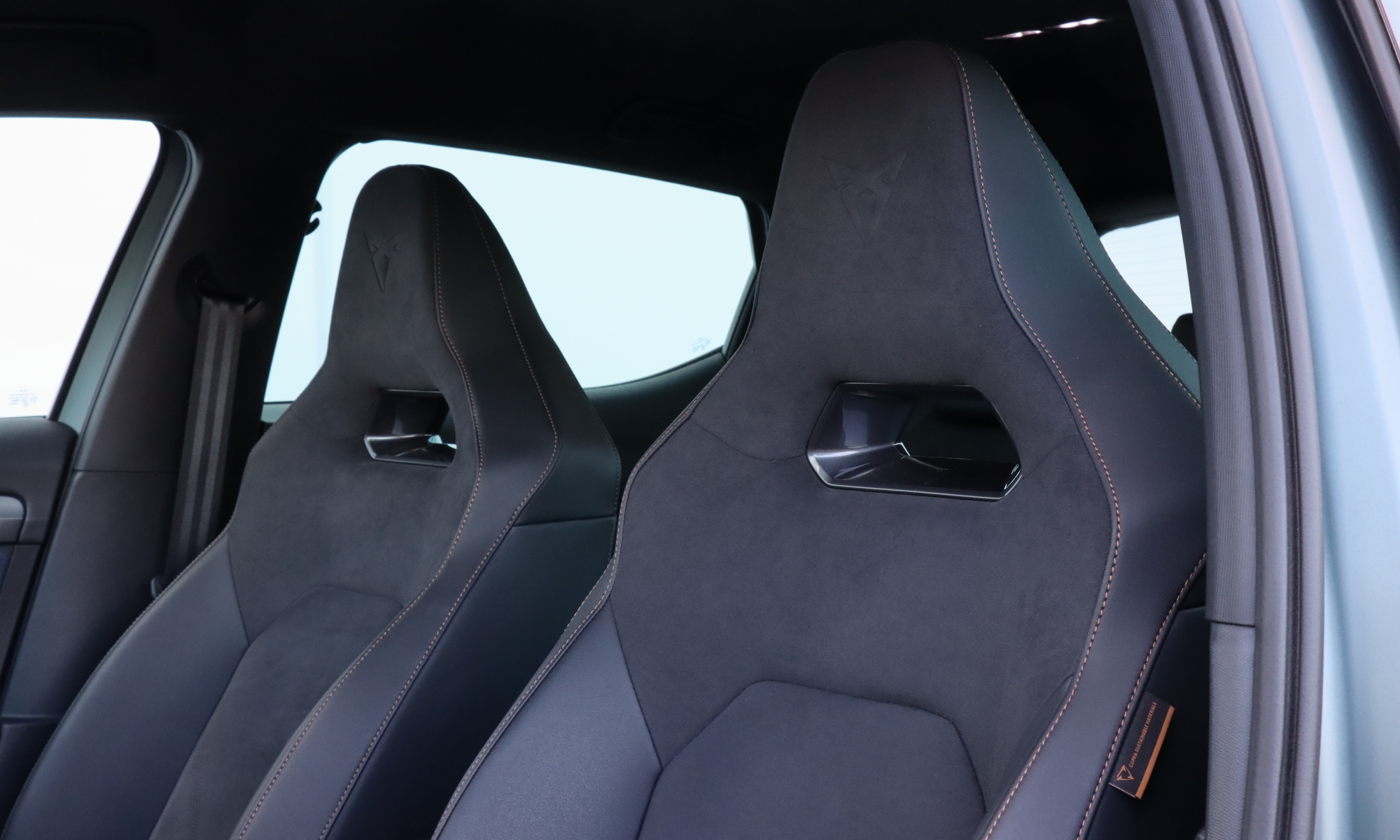 Opcionálisan akár Sabelt kagylóülések foghatnak a tempós kanyarokban és négydugattyús Brembo fékek lassíthatják a plug-in hibrid Leont, de ezekből egyik sem volt a tesztautóban. Nem is hiányoznak, mert az ilyen holmik már pályanapot kívánnak. A sima sportülések pozíciója pont jó, pont elég kényelmesek és pont eléggé tartanak, ahogy kell. Nem túl szépek az úszónyerges alap fékek, de az energiát visszanyerő villanymotorral együtt a sokadik fékezésnél is határozottan fognak.