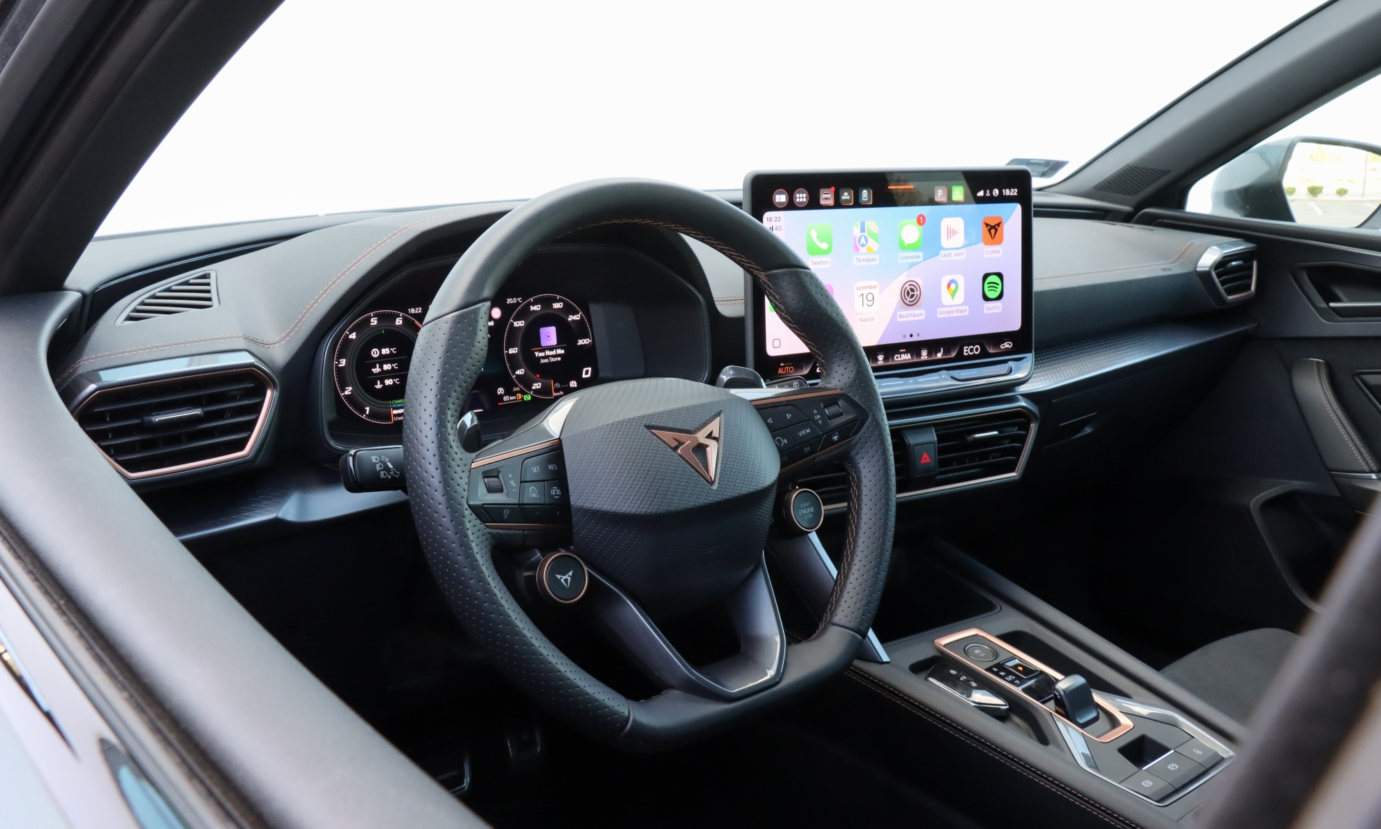 Éppen nem lóg bele a 13 colos érintőképernyő szélvédő látóterébe, de ez a méret már túlkapás. Ahogyan az olyan közeli rokonokban, mint a Volkswagen Golf vagy a Škoda Octavia, úgy ebben a Cupra Leonban is több gombbal és kevesebb pixellel könnyebb volna elérni az olyan alapvető funkciókat, mint a klíma vagy a sebességtúllépésre figyelmeztető pittyegés némítása. A fedélzeti rendszer sokat fejlődött és gyorsult az első kínos pillanatok óta, de évekkel és frissítésekkel később még mindig olyan, mintha nem lenne kész.
