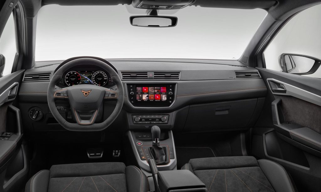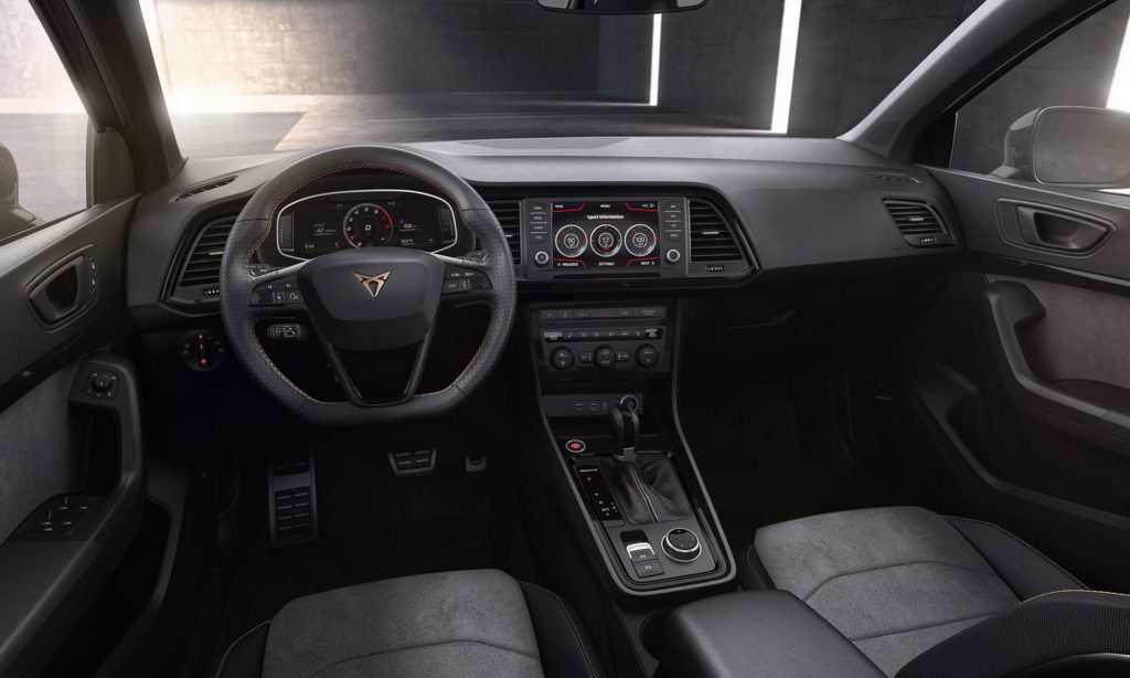 19 colos kerekek, méhsejtrácsos hűtőmaszk, sportos lökhárítók és légterelők, kétoldalt vezetett dupla kipufogóvégek, és persze a logók árulják el, hogy ez az Ateca már nem a Seat, hanem a Cupra kínálatából érkezett. A kormánykerékre is a Cupra emblémája került, és még az ajtók kilépőfénye is ezt a logót vetíti az aszfaltra.