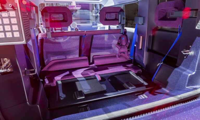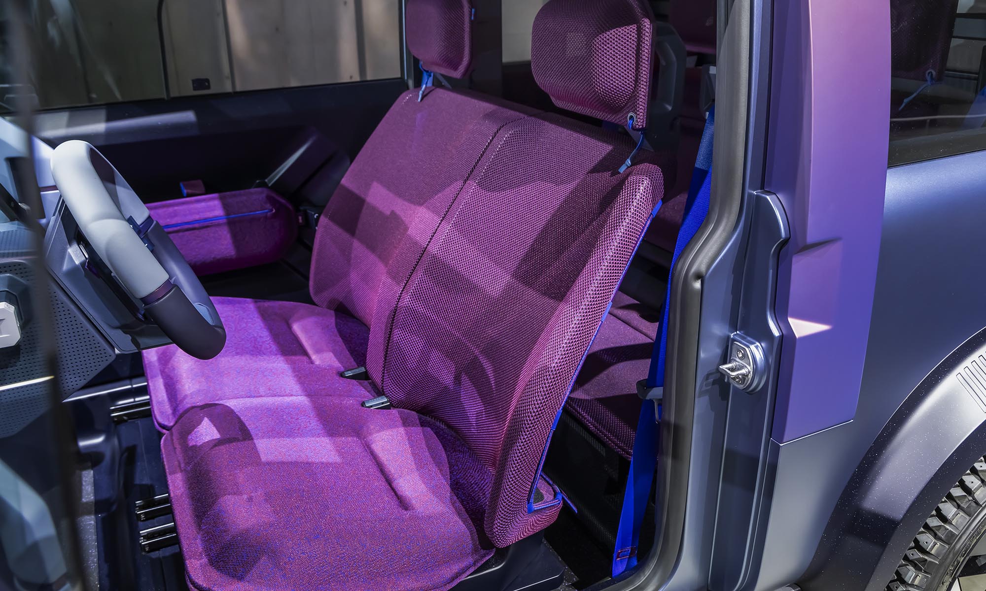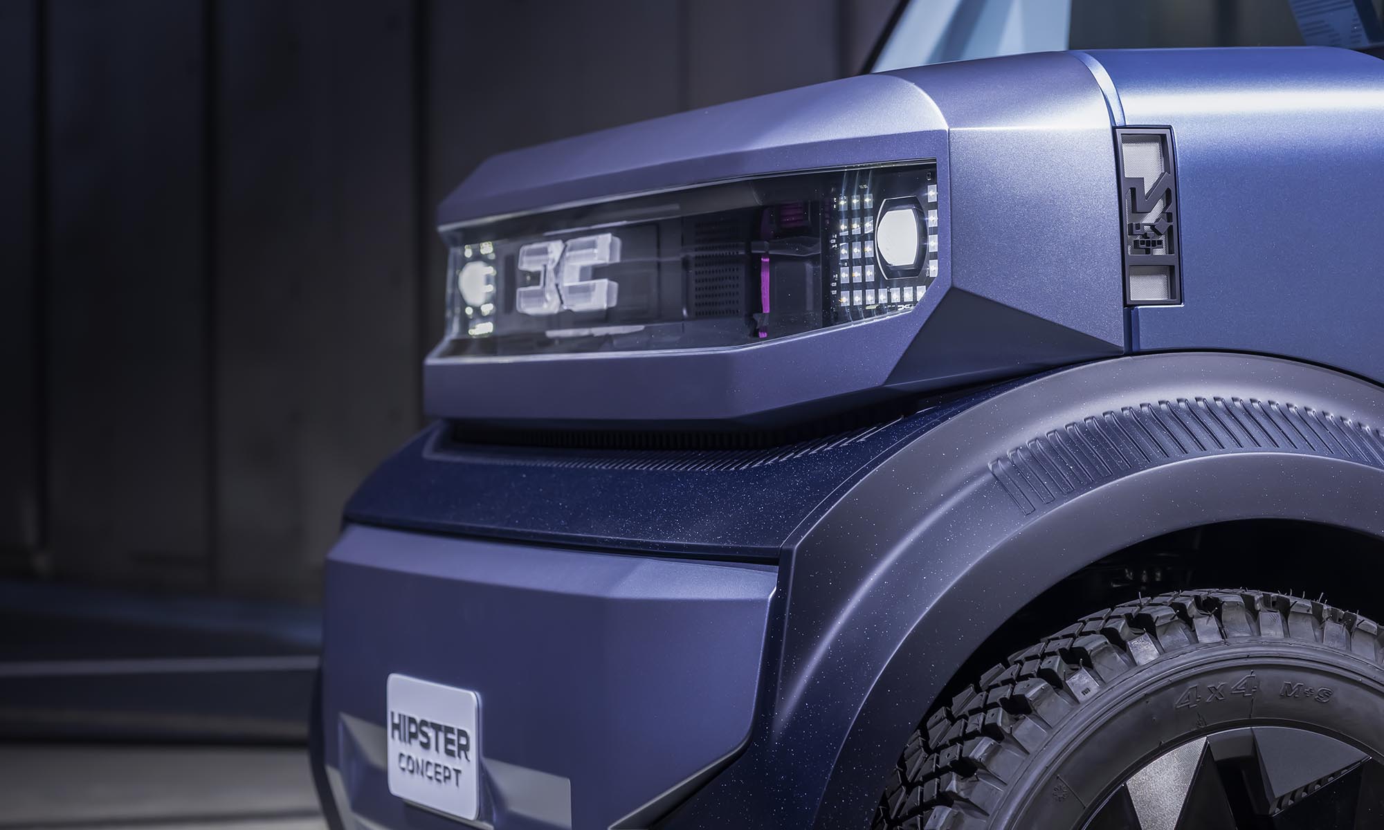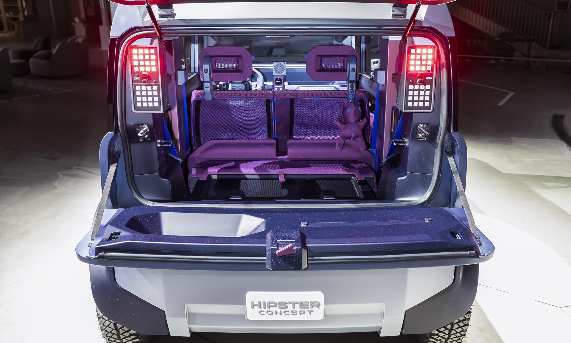 A Hipster belsejében minden a praktikumról szól. Az ülések egyszerűek, látszik a fémváz, a kárpit meleg hatású hálós anyag, a két különálló első ülés pedig egy padként simul egymáshoz – nosztalgikus utalás a régi idők autóira. A digitális forradalom is segít az egyszerűsítésben: a telefonod a kulcs, a kijelző és a zenelejátszó is egyben.