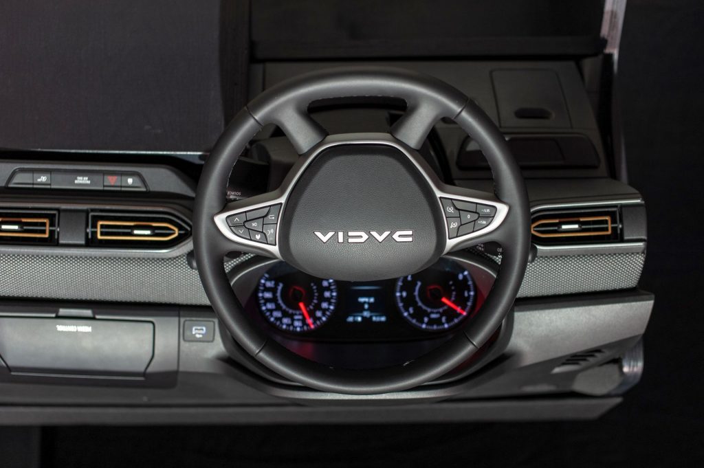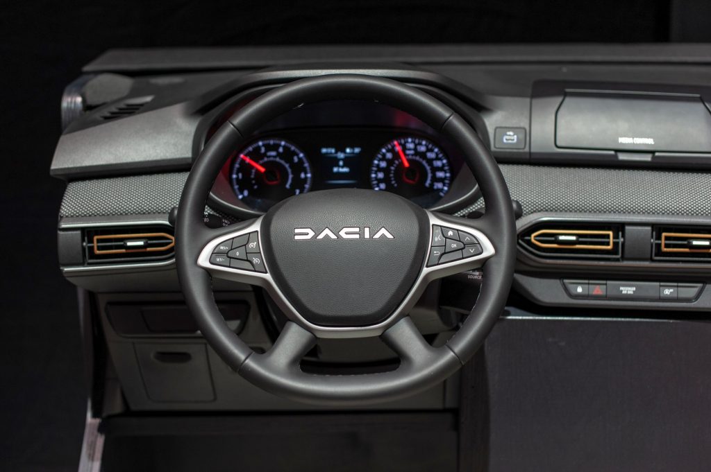 A kabinban a kormányon is feltűnik az új márkafelirat. Ja, tényleg: vajon a Daciánál észrevették, hogy az új betűtípussal fejjel lefelé is elolvasható a márkanév? Ha nem, és lennének terveik vele, csak szólok: a viduc.com még eladó!