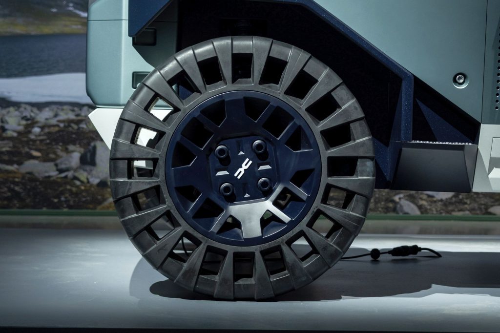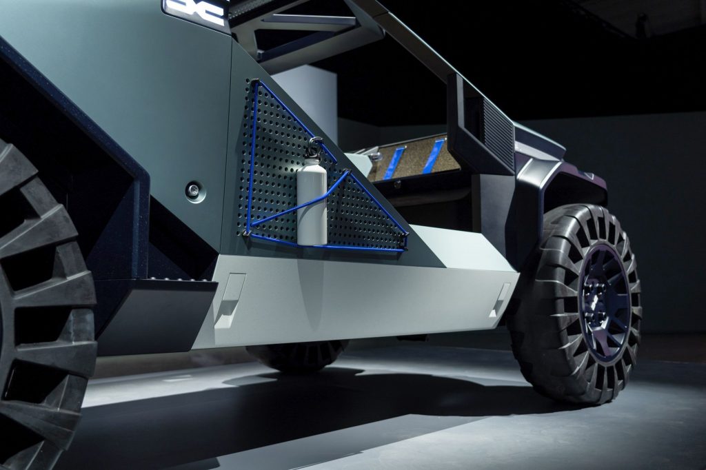 Kezdjük a holdjáróval, mégiscsak az volt a tárlat legizgalmasabb eleme! Manifesto (magyarul manifesztum); latin eredetű szó, jelentése: kijelentés, nyilatkozat, kiáltvány. Ennek a kiáltványnak tömör összefoglalása az Essential but Cool szlogen, vagyis hogy attól, hogy valami lényegre törően minimalista, még nagyon is lehet menő! És a Dacia Manifesto koncepció tényleg menő, pedig karosszériája annyira csak a legszükségesebb dolgokra szorítkozik, se ajtaja, se ablaka nincs.