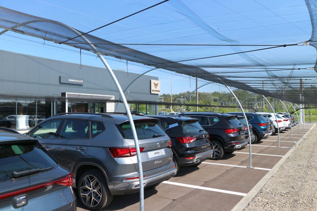A félhektáros telket a sportos utcai autók stílusához illő módon gyönyörű, sima, friss fekete aszfalttal burkolták, a szalon előtt parkoló új autók fölé pedig 16 millió forintos jégkár-védő hálót húztak.