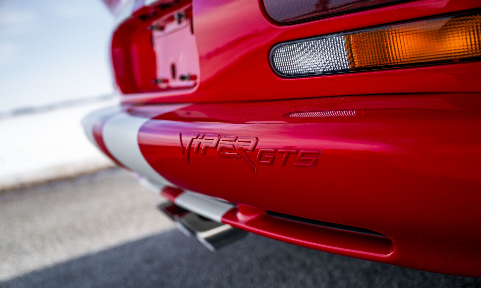 Piros fényezésén fehér csíkok futnak végig, ilyen az összes autó ebben a búcsúzó szériában. Amíg az első Vipernek nem voltak rendes ablakai és teteje, addig a GTS már klasszikus kupé formájú. A sziluettjét a Pete Brock által tervezett Shelby Cobra Daytona ihlette, de a tízhengeres motor önmagában is meghatározta az autó arányait.