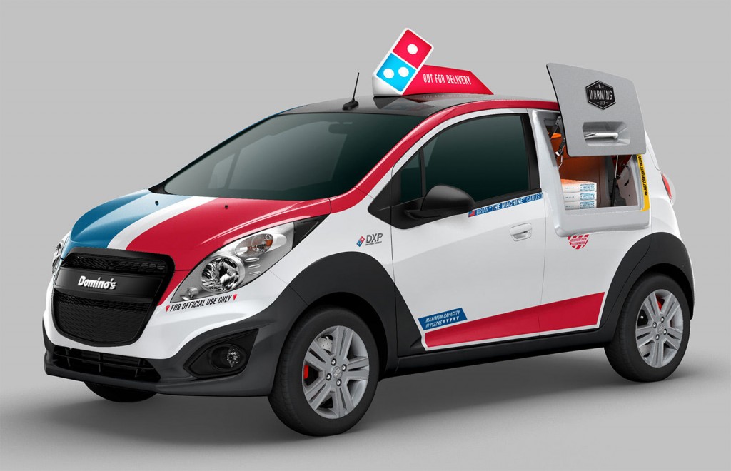 Ennél néhány fokozattal profibb megoldás a Domino’s Pizza elektromos Chevrolet Sparkja, amely nem csak melegen tartja a pizzákat, de a cég logóját is kivetíti a kocsi mellé a talajra. Első menetben száz Sparkot rendelt az évi 400 millió pizzát kiszállító cég.