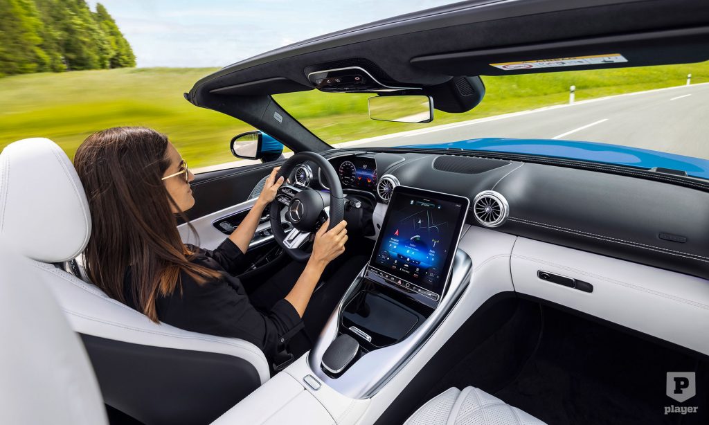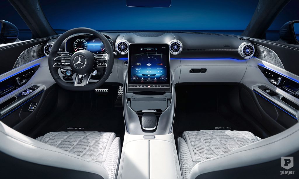 A mostanában nagyon divatos „műszerfalra felerősített táblagépet” nem mindenki szereti, de ez egy olyan megoldás, ami értelmet ad a különálló elrendezésének. A Mercedes-AMG SL további részleteit csak később fedik fel, mindenesetre az AMG GT-nél kényelmesebb roadsterre számíthatunk, ami akár annak vászontetős változatát is felválthatja.