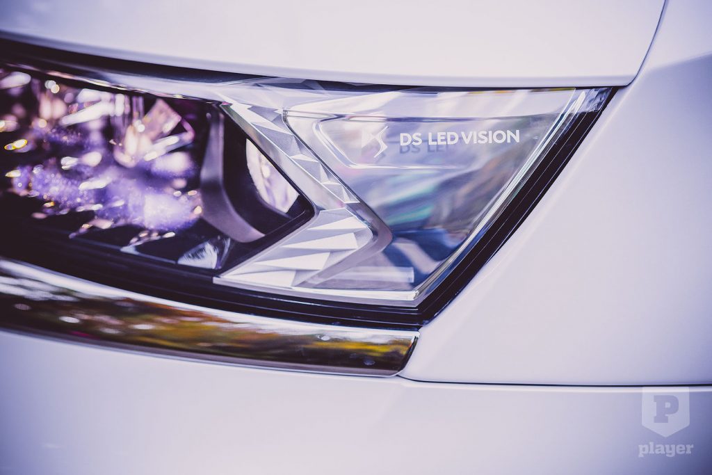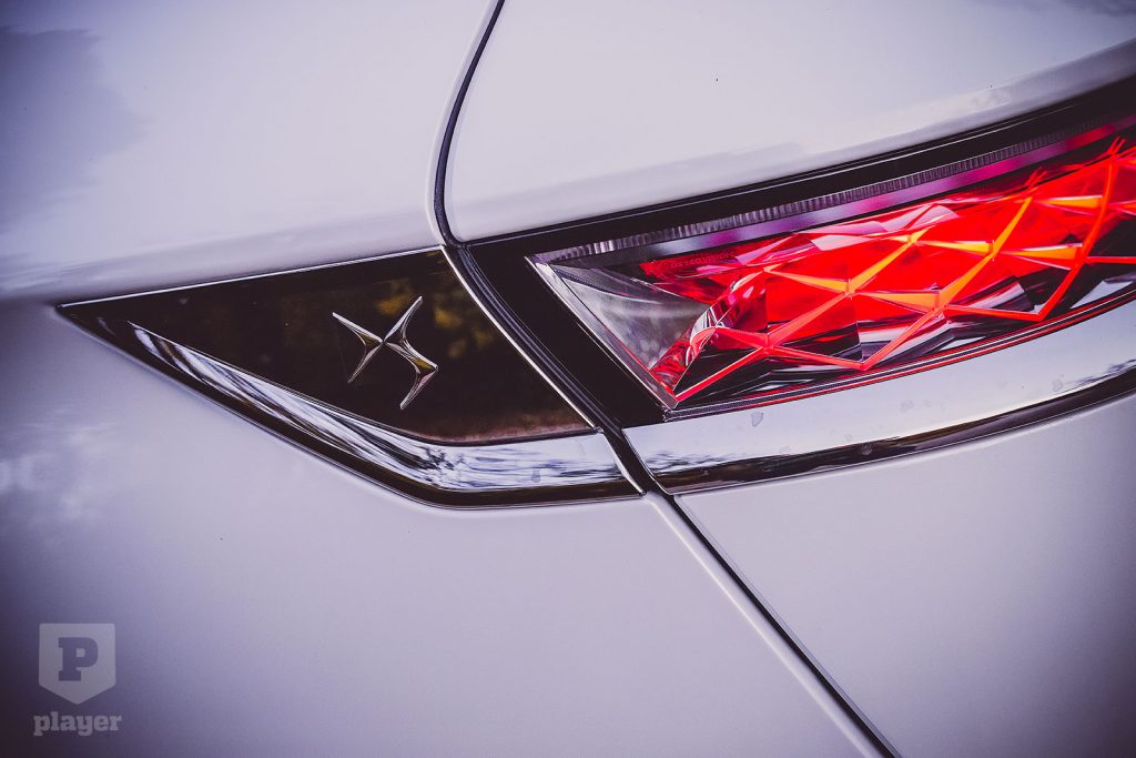 A kocsi elejét nehéz egy-két szóval leírni, mintha ötletszerűen futnának a krómcsíkok, a DS-logós hűtőmaszk elegáns, a lökhárítóban lévő inkább csak műszaki kötelesség, a rendszám pedig jogszabályi, sokat ront az összképen. A fényszórók alakja nem emlékezetes, ahogy a hátsóké se – amíg nem kapcsoljuk fel a világítást.