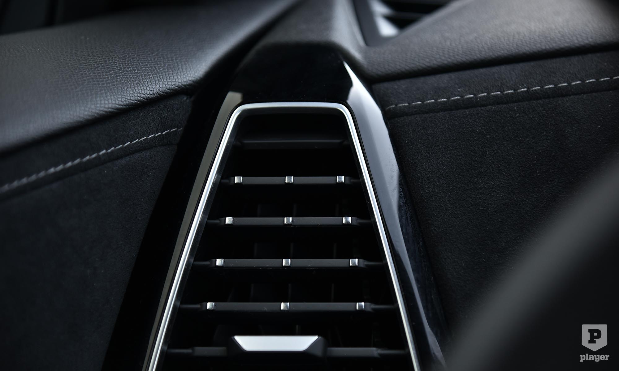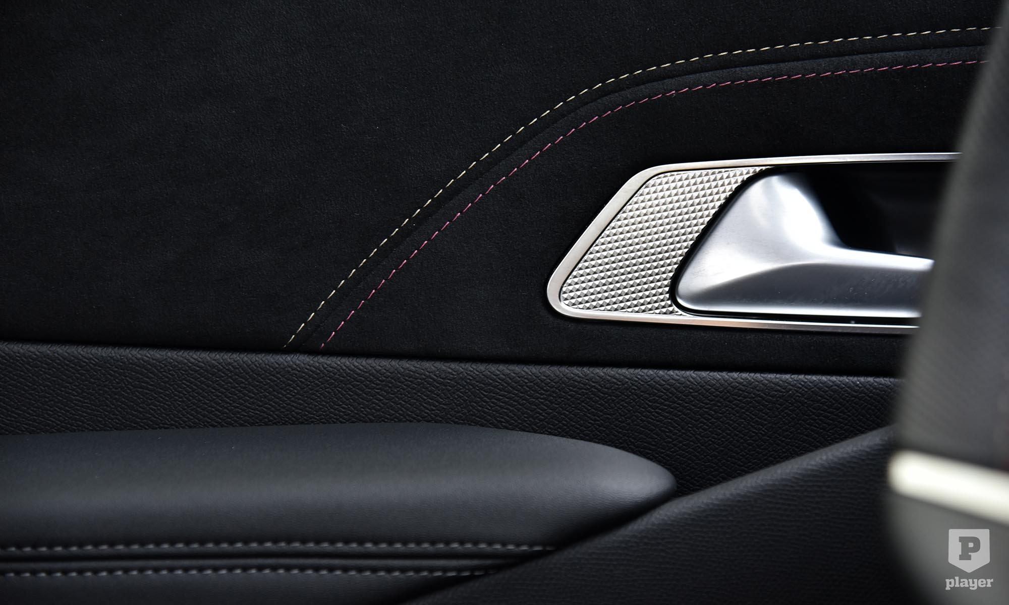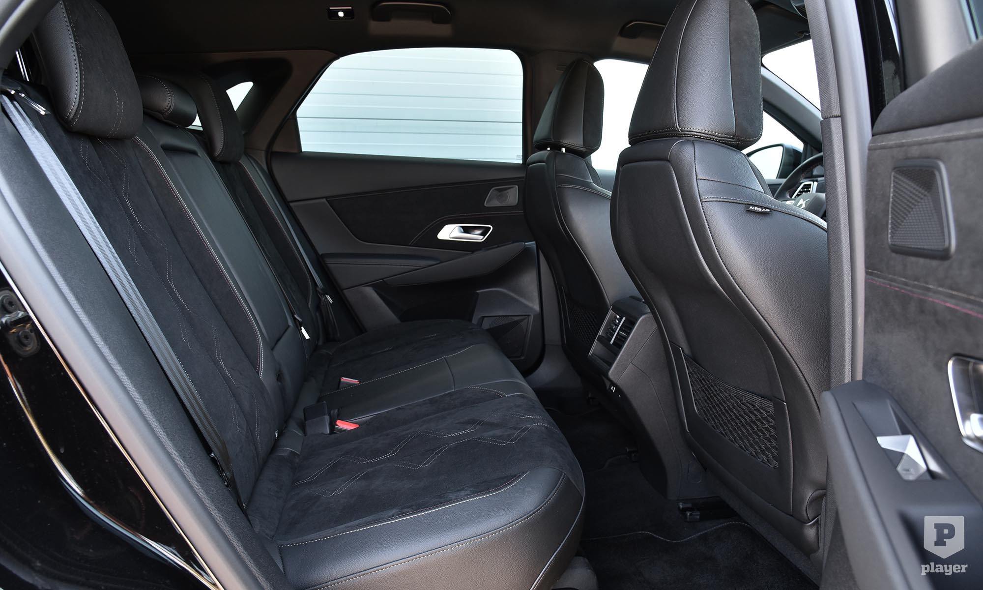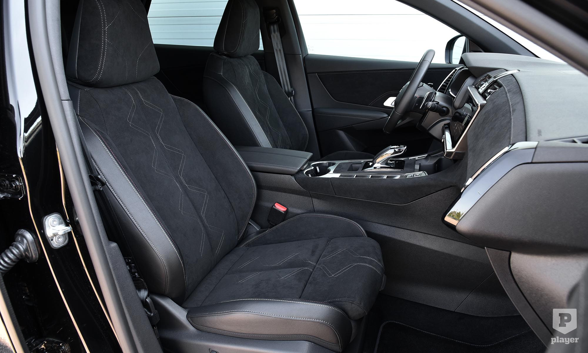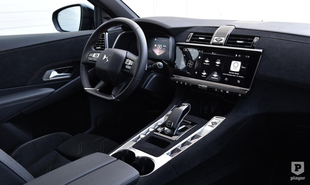 Mélyfekete Alcantara a kárpit, az alapvetően elegáns DS 7-eshez illik is a sötét árnyalat, nem a komorság, hanem az igényesség jut eszünkbe, annak is köszönhetően, hogy jutott Alcantara a műszerfalra is, és dekorációnak nem fényes feketét képzeltek a franciák – mint szinte az összes mai autóban –, hanem jóval igényesebb, a karcoktól és az ujjlenyomatoktól is kevésbé veszélyeztetett fémszínű felületeket. Van azért fényes fekete műanyag is, de a mennyisége nem zavaró.